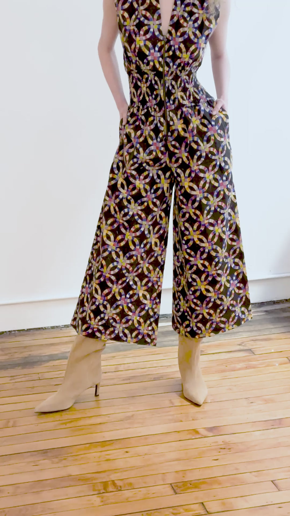 • Sleeveless wide-leg jumpsuit featuring a striking multicolor geometric pattern on deep black ground