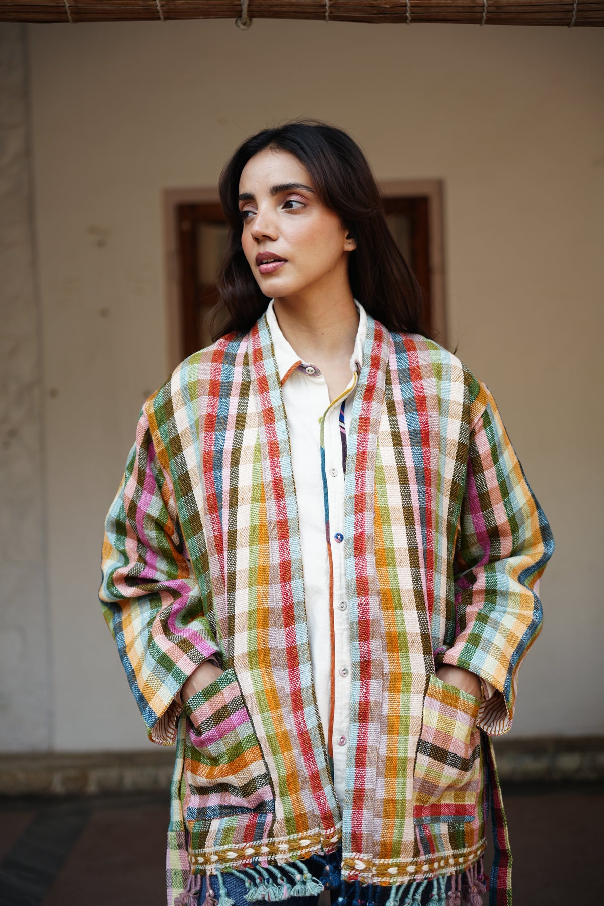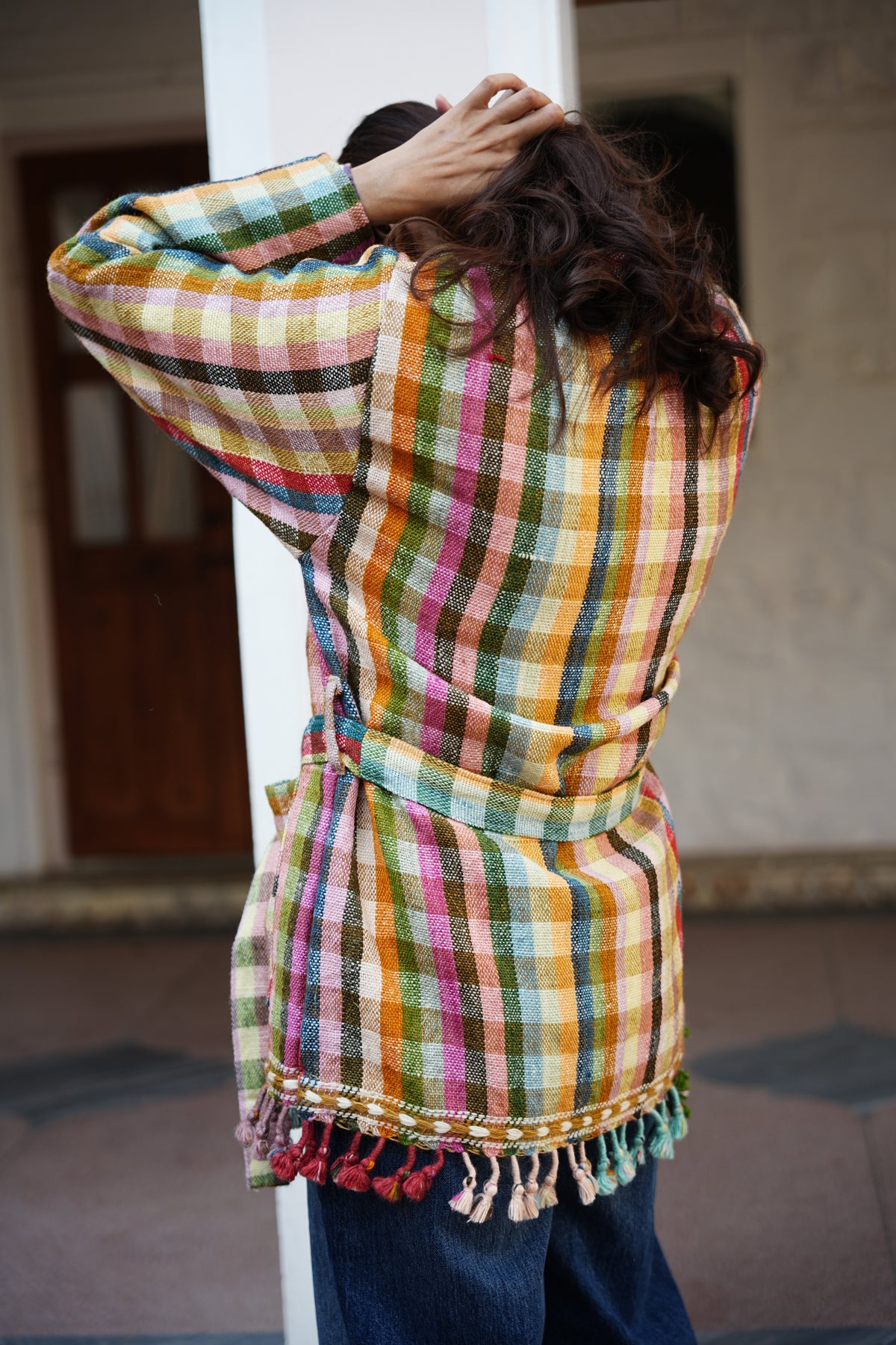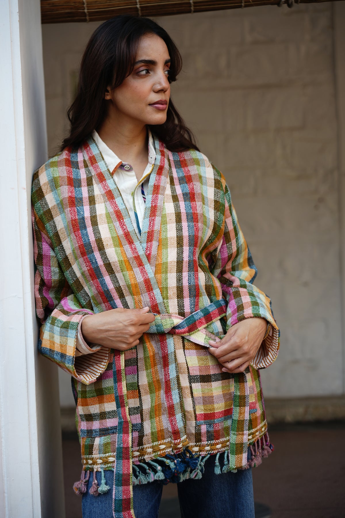 A statement layer woven with warmth, color, and craft. The Valley Jacket in Forest Chex is made from 100% handloom merino wool with a soft cotton lining, giving it a luxurious yet wearable feel. Rich forest-inspired checks blend jewel tones, earth tones, and playful brights — a signature textile that brings depth and artistry to cooler days.