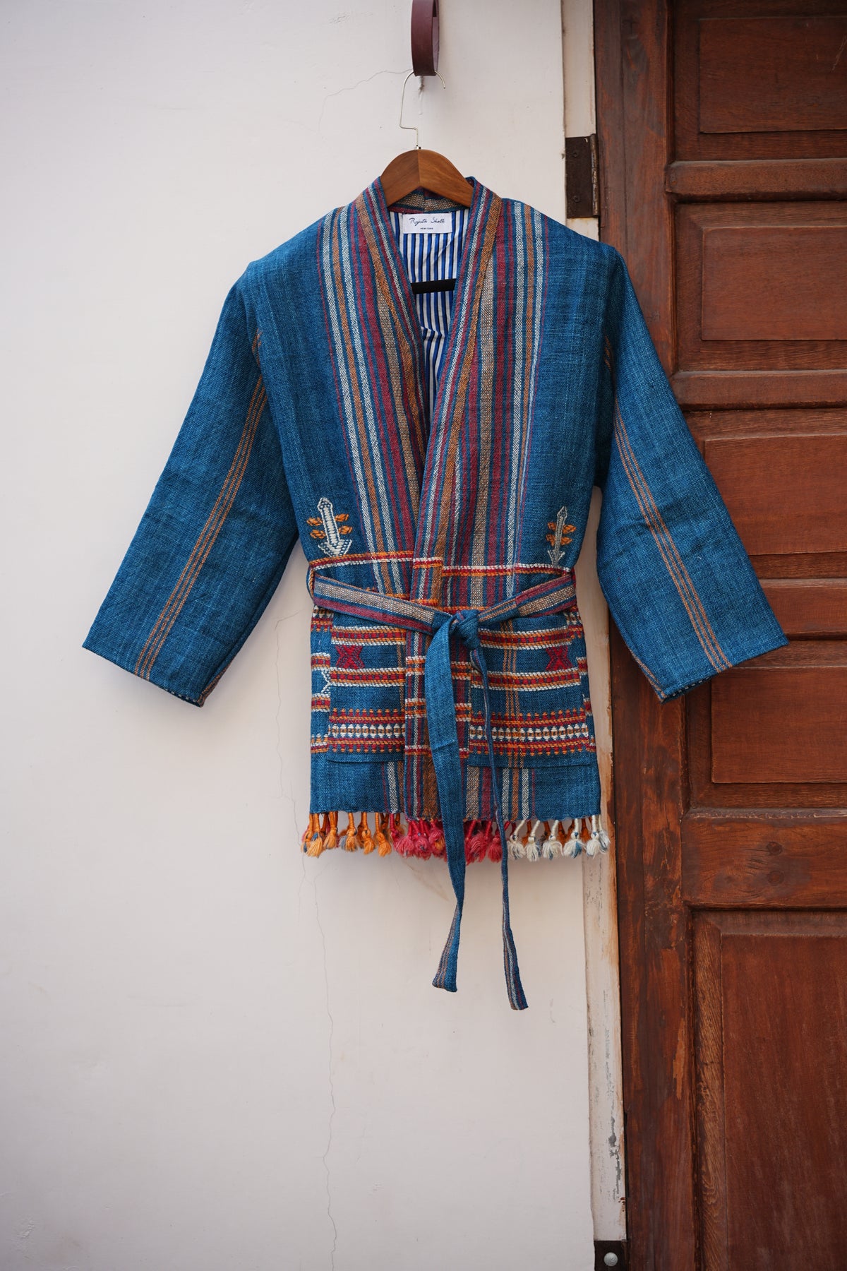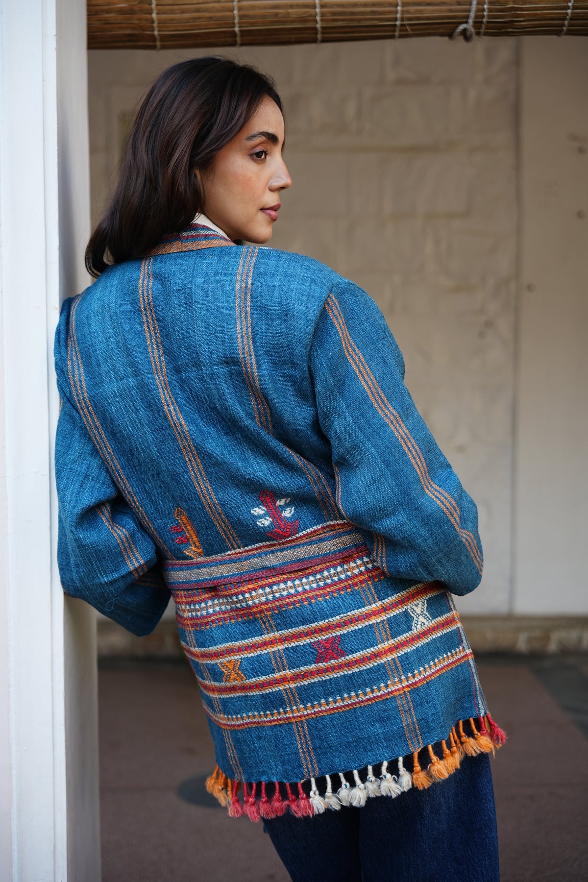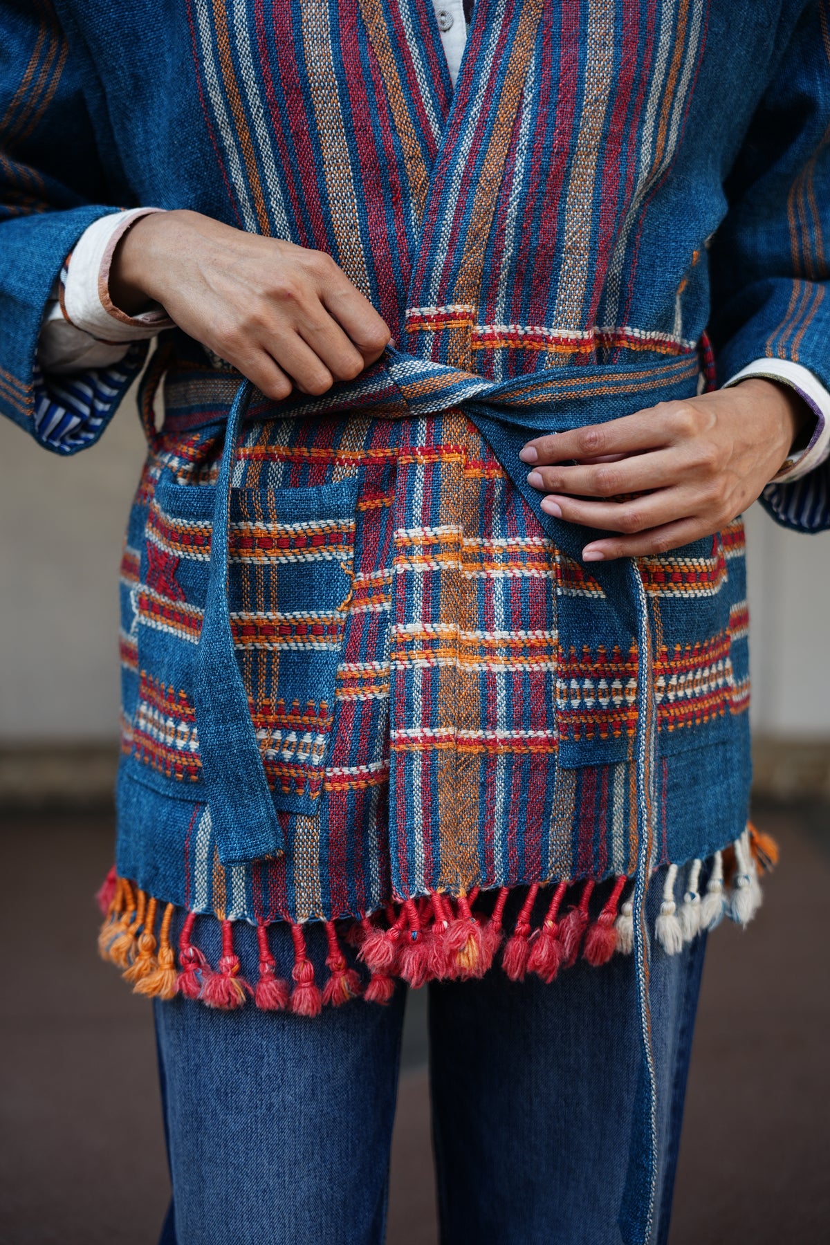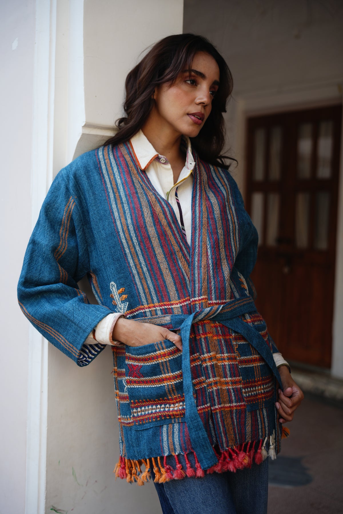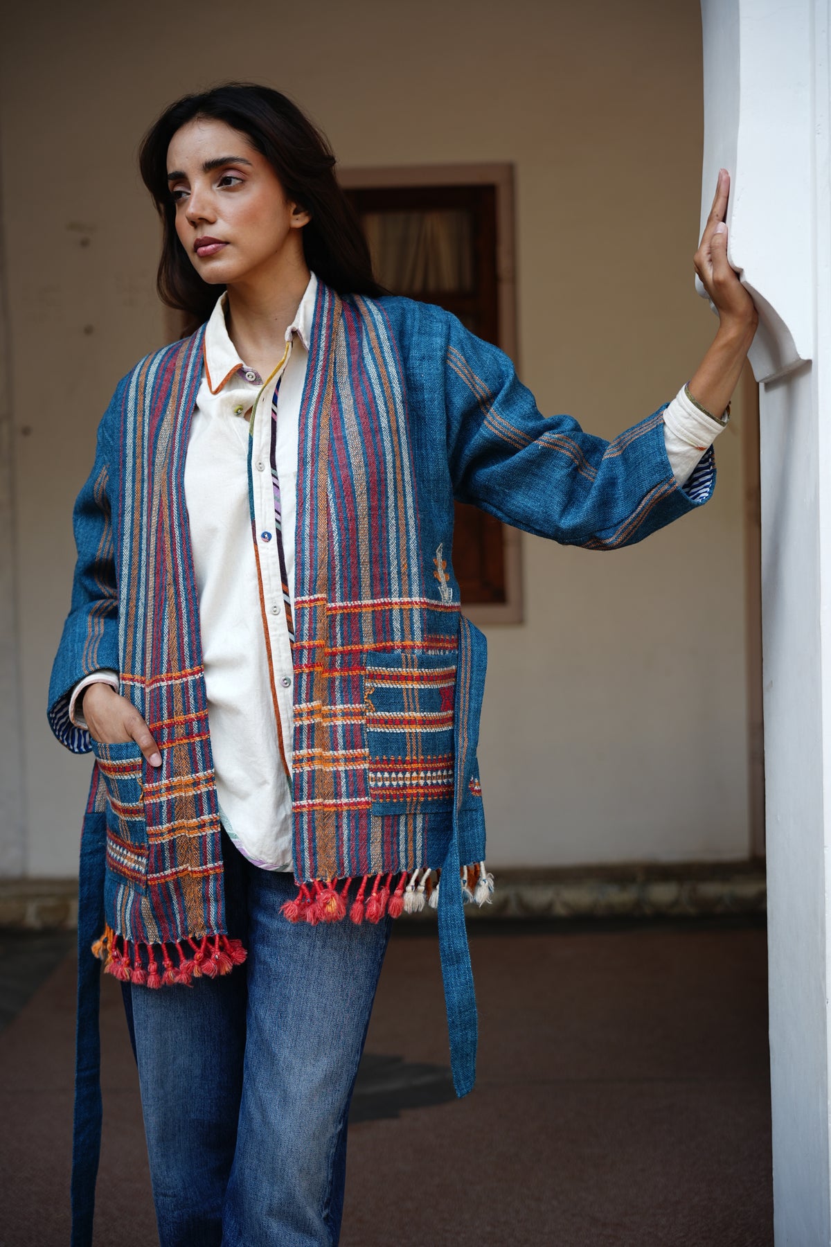 Our signature Valley Jacket silhouette offers an easy, relaxed fit you can wear open or belted, while the indigo base grounds the bright woven details. Finished with fringed edges for a tactile, handmade touch, it’s the jacket that turns simple layers into something truly special.