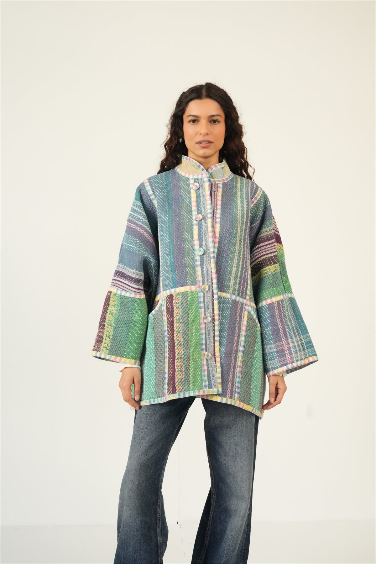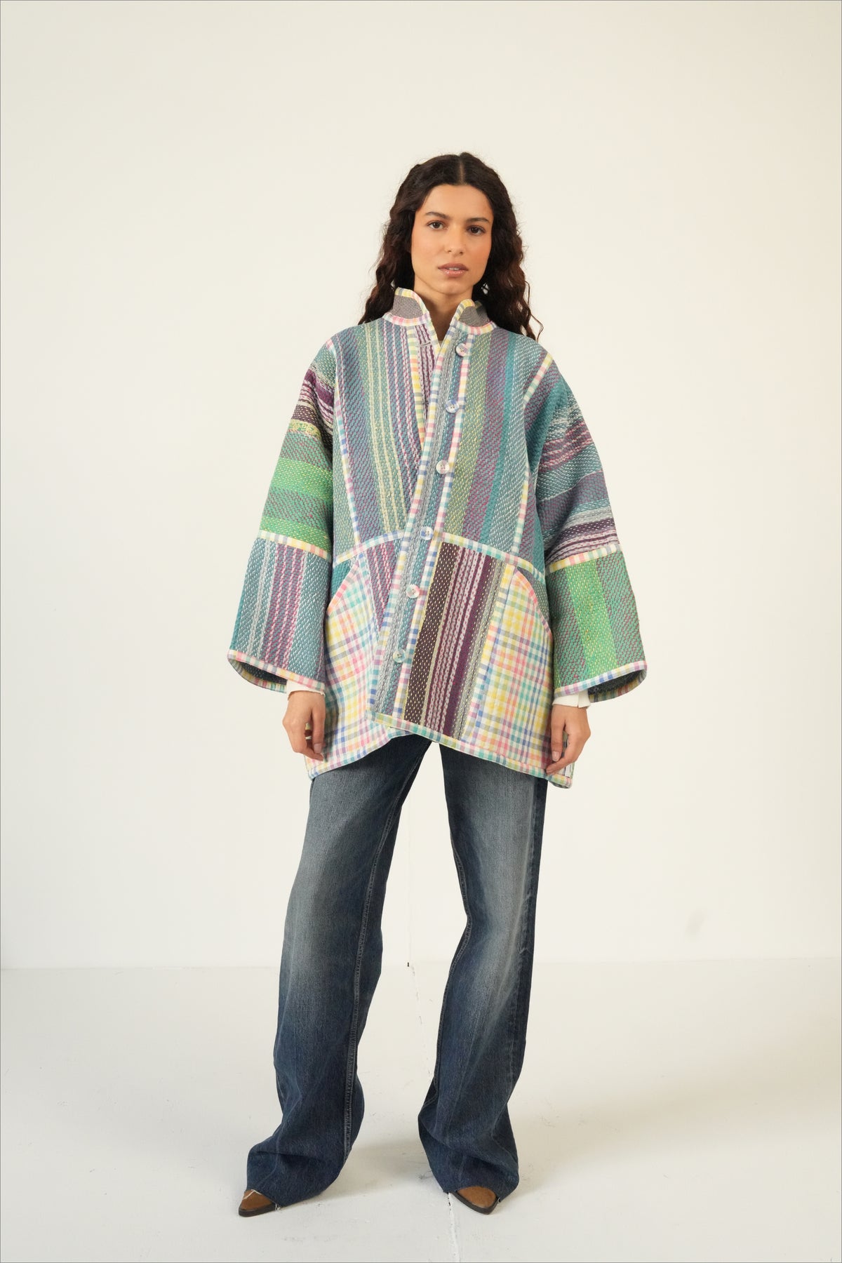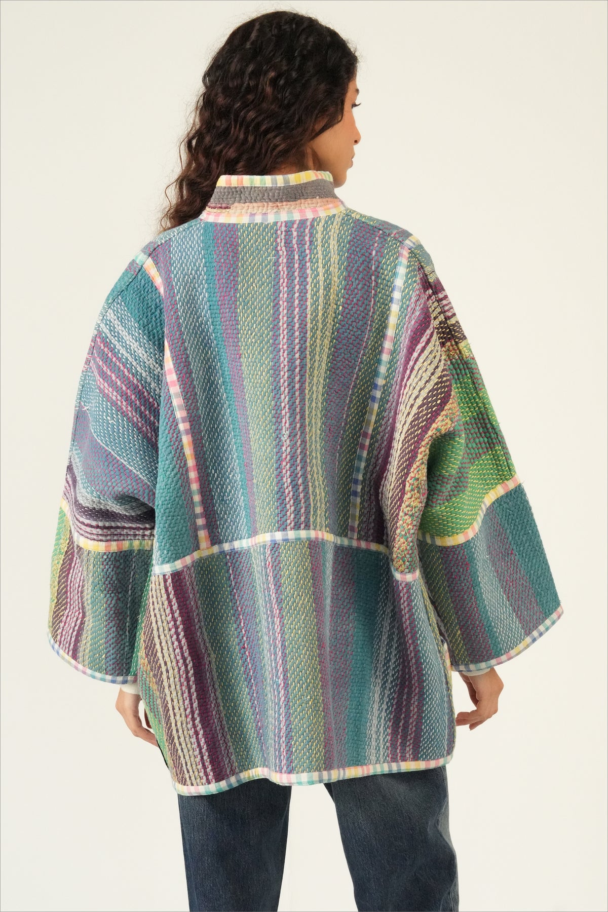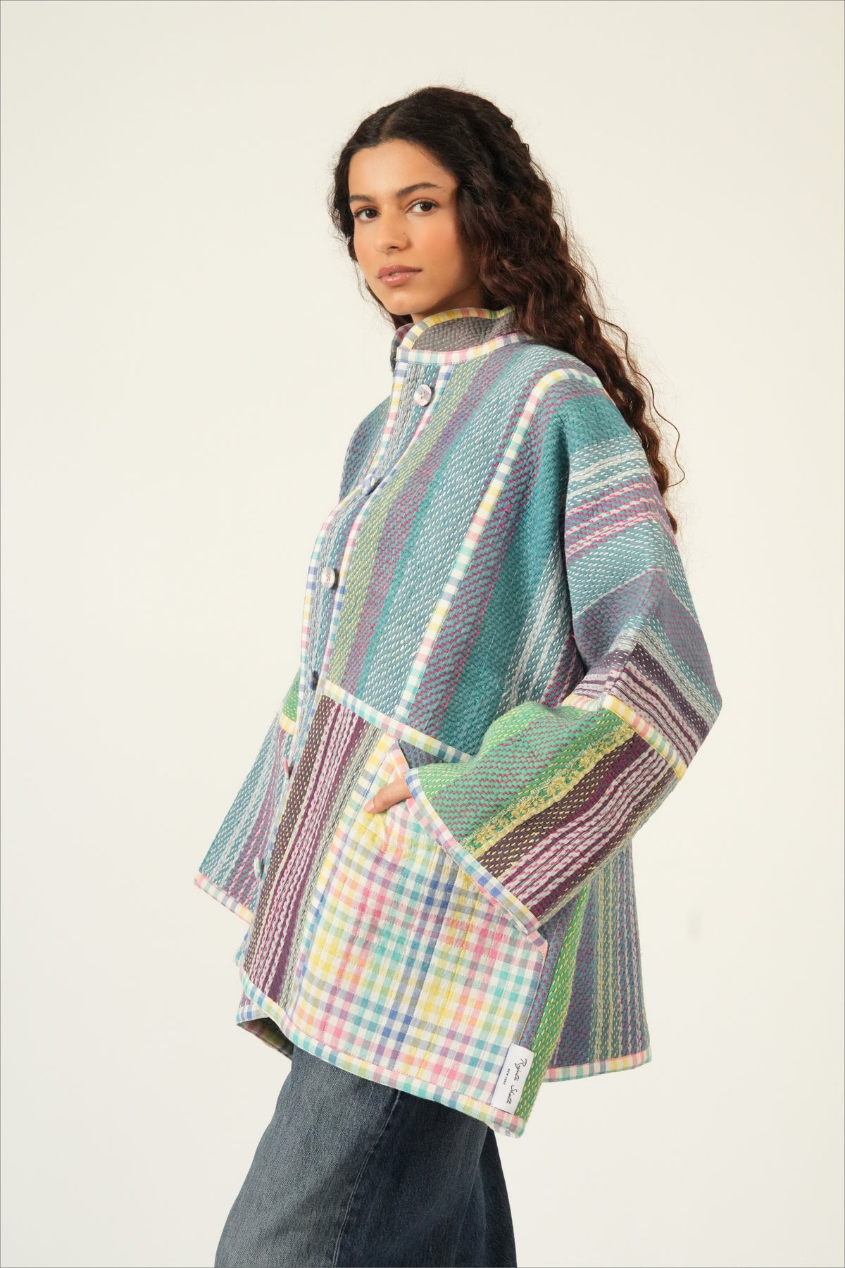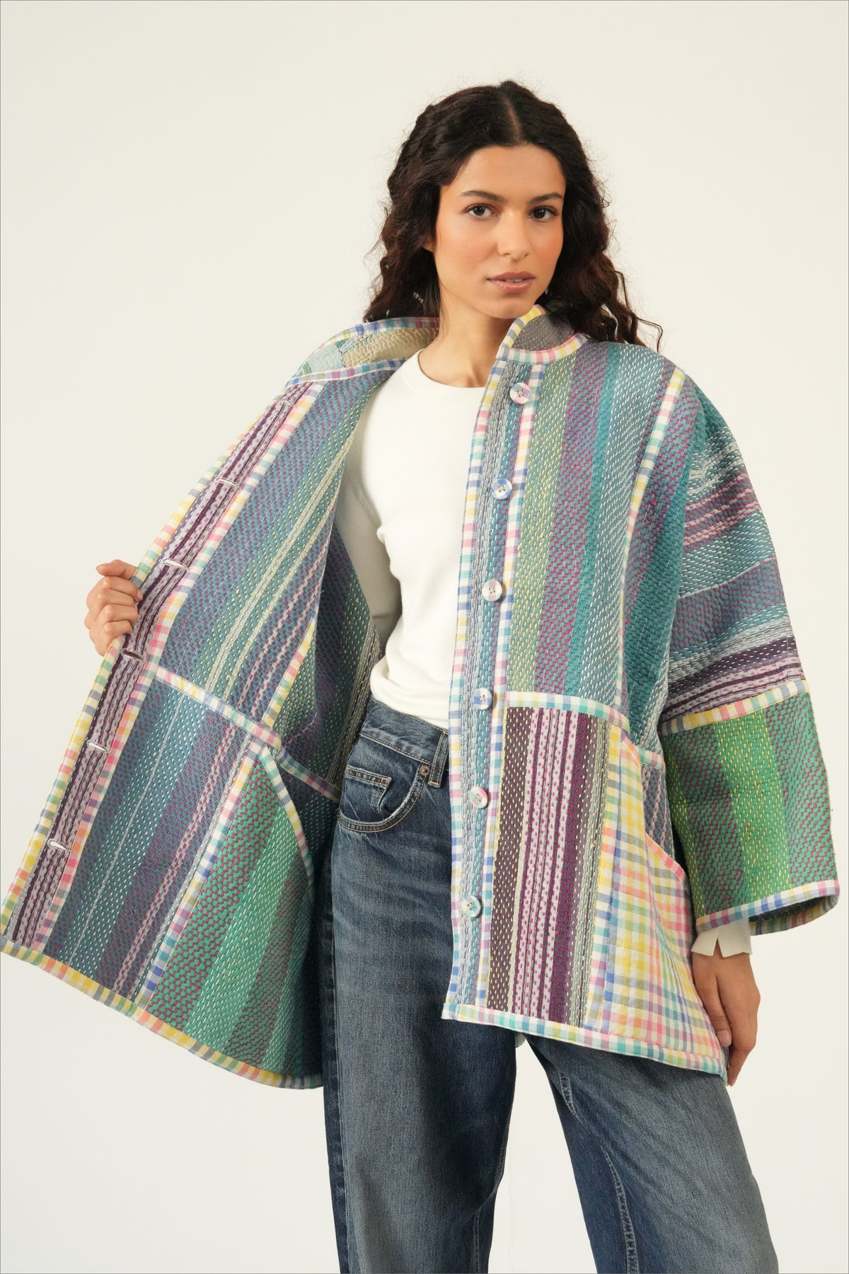 Two coats in one — twice the color, twice the story. The Revival Reversible Coat is created from reclaimed vintage cotton Kantha quilts married with leftover fabric from some of our best-selling Chex textiles, each side revealing a different palette and personality. Flip it depending on your mood, your outfit, or the season; each way offers its own charm. Because every quilt and textile pairing is unique, your coat is truly one of a kind.