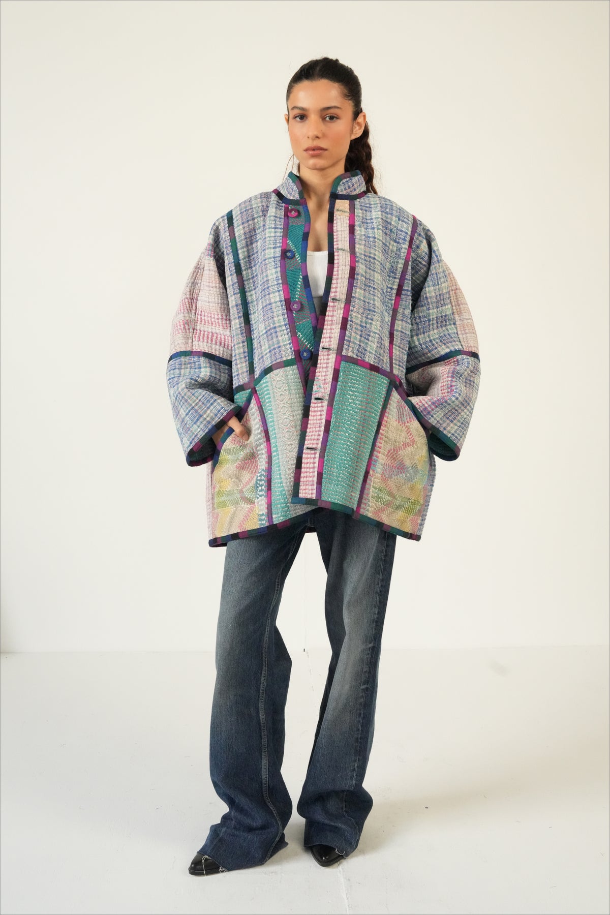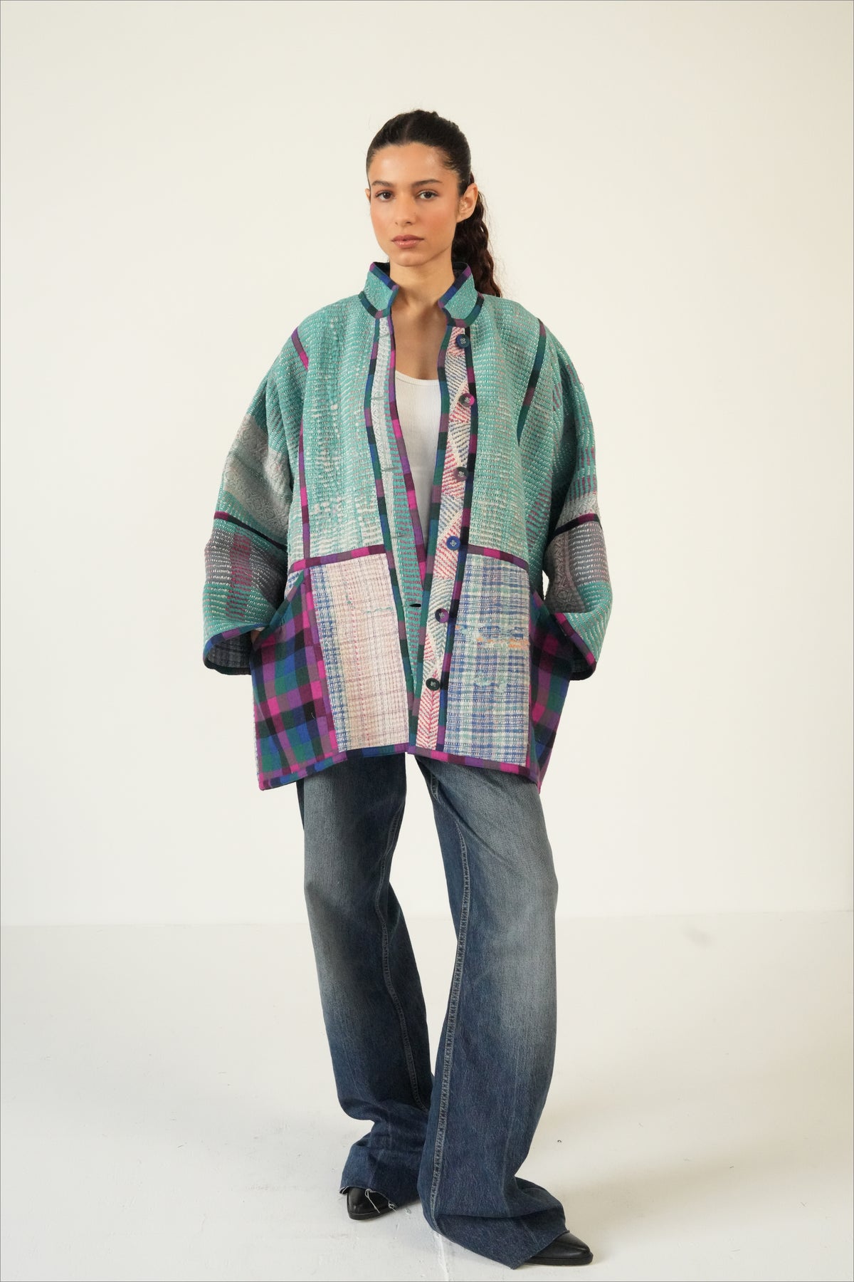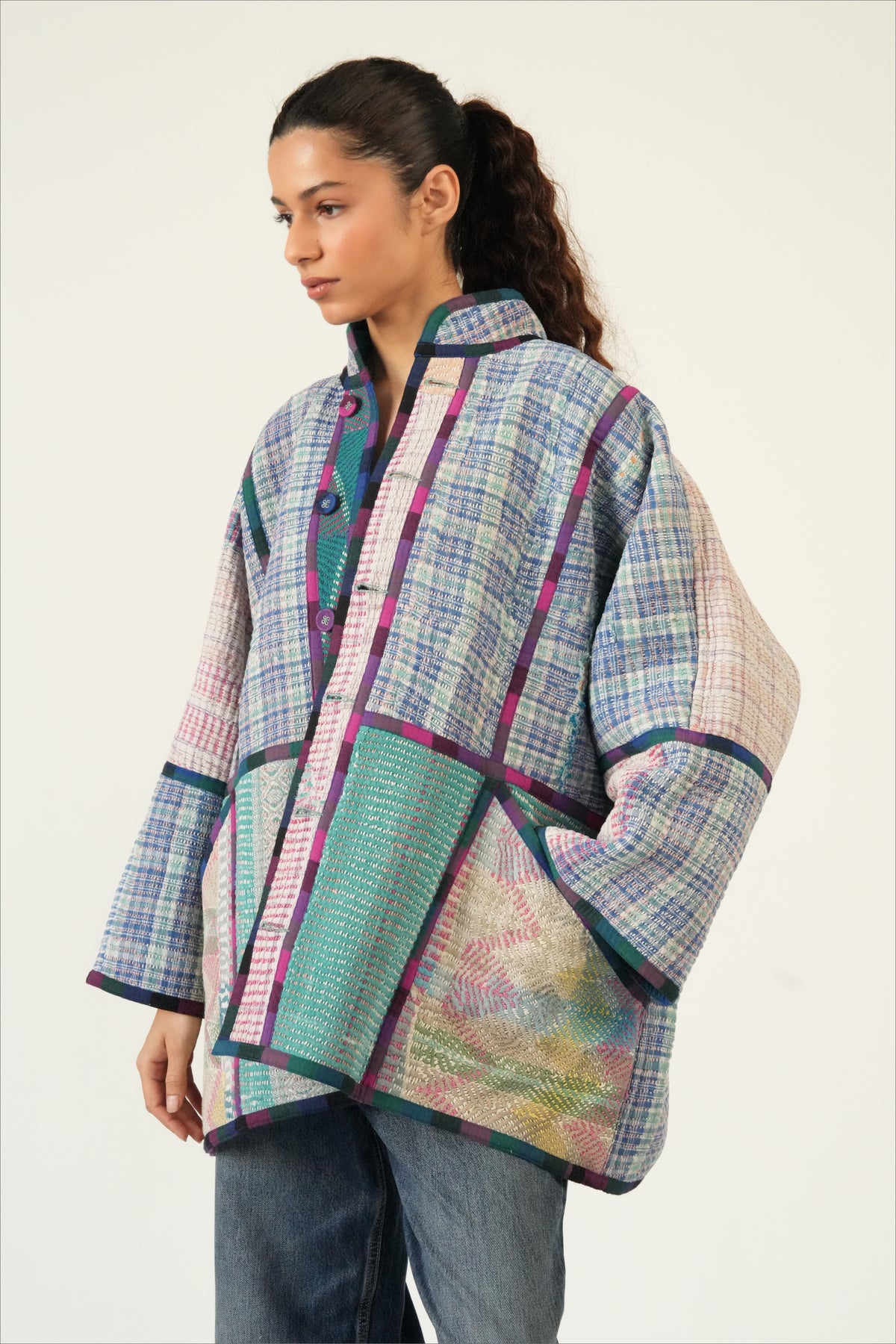 Two coats in one — twice the color, twice the story. The Revival Reversible Coat is created from reclaimed vintage cotton Kantha quilts married with leftover fabric from some of our best-selling Chex textiles, each side revealing a different palette and personality. Flip it depending on your mood, your outfit, or the season; each way offers its own charm. Because every quilt and textile pairing is unique, your coat is truly one of a kind.