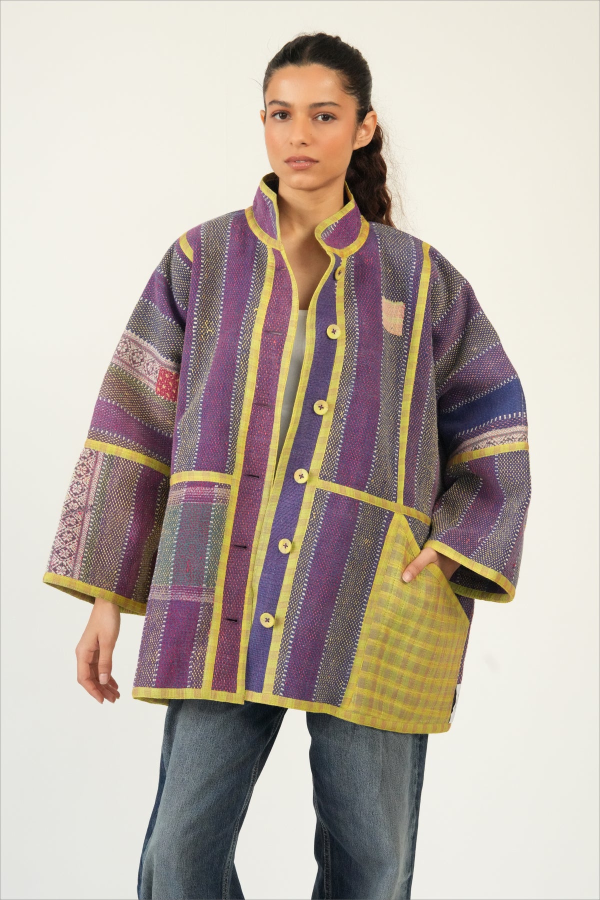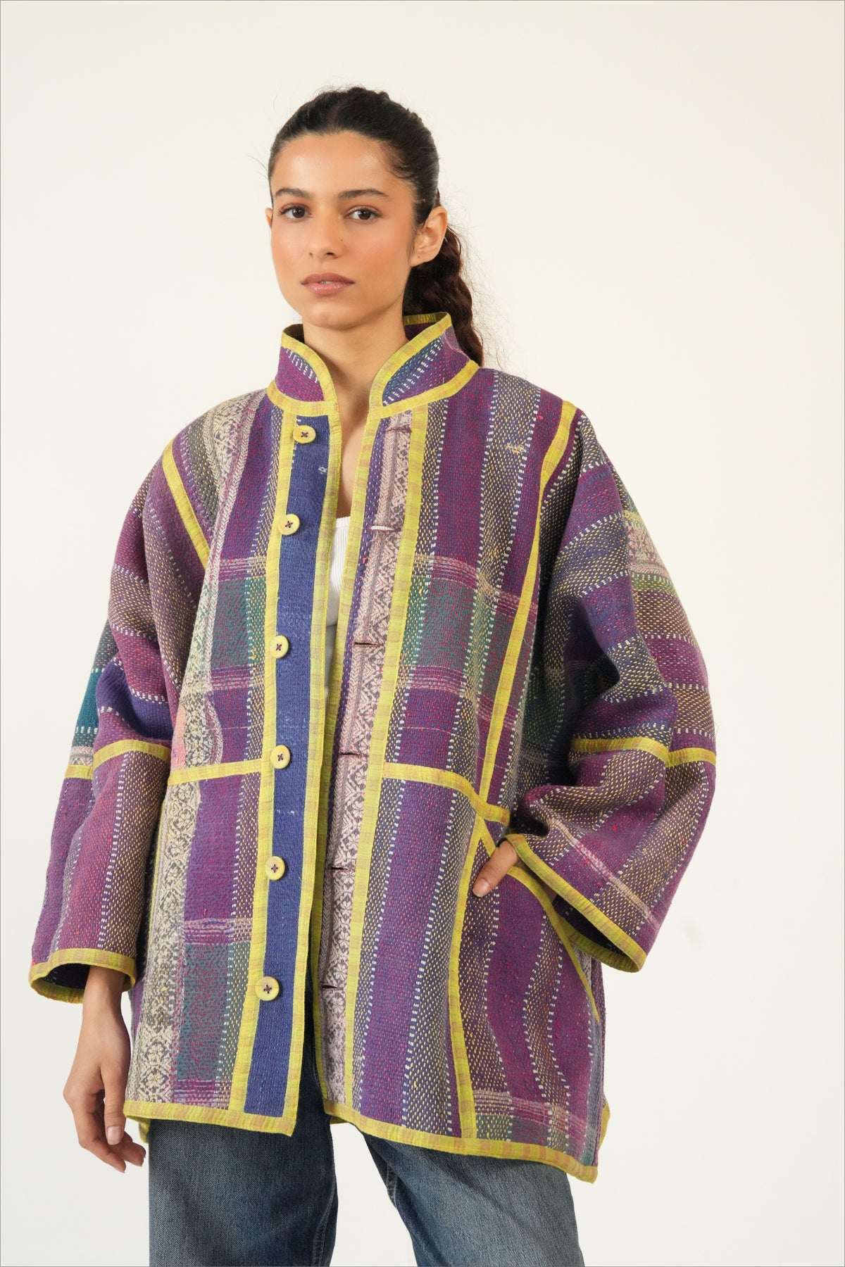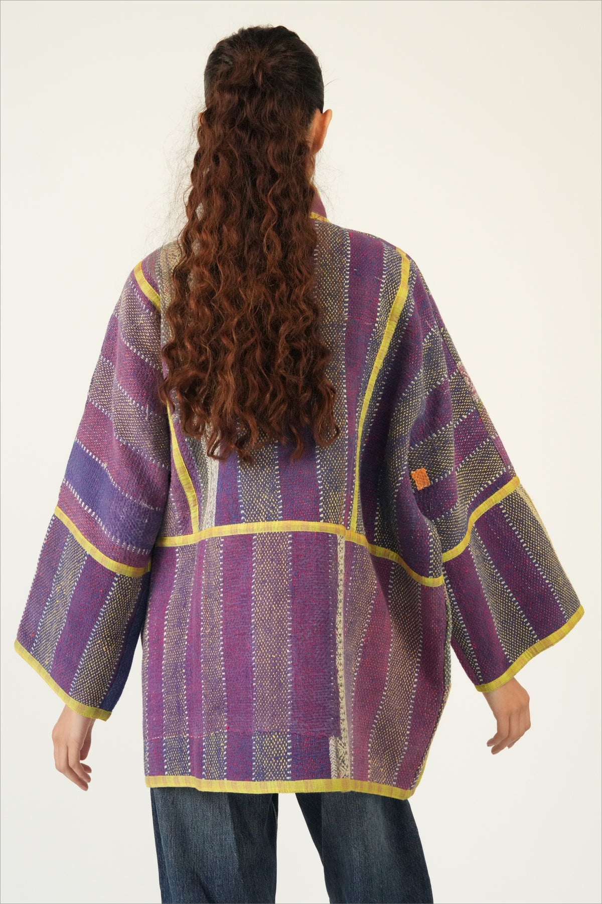 Two coats in one — twice the color, twice the story. The Revival Reversible Coat is created from reclaimed vintage cotton Kantha quilts married with leftover fabric from some of our best-selling Chex textiles, each side revealing a different palette and personality. Flip it depending on your mood, your outfit, or the season; each way offers its own charm. Because every quilt and textile pairing is unique, your coat is truly one of a kind.