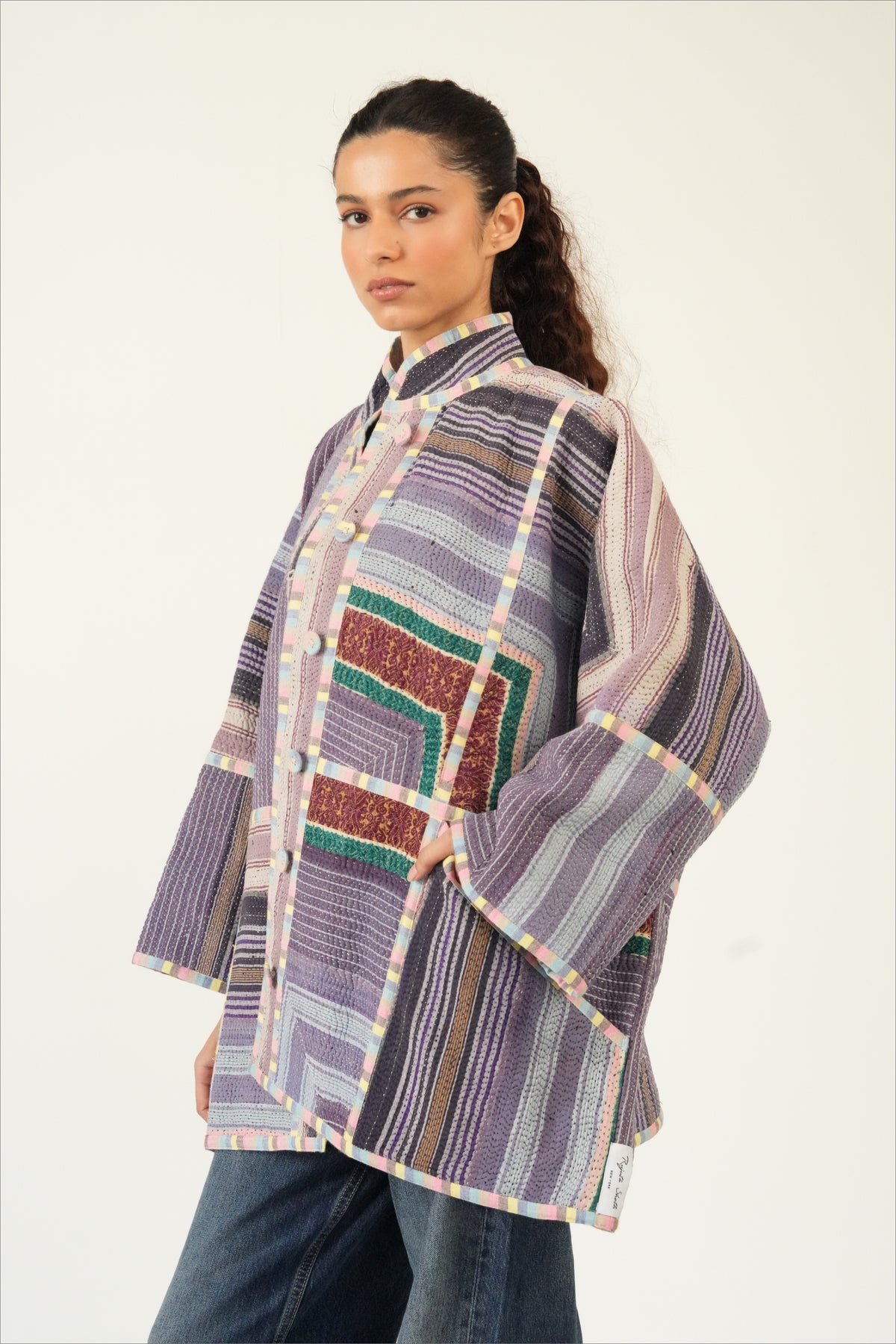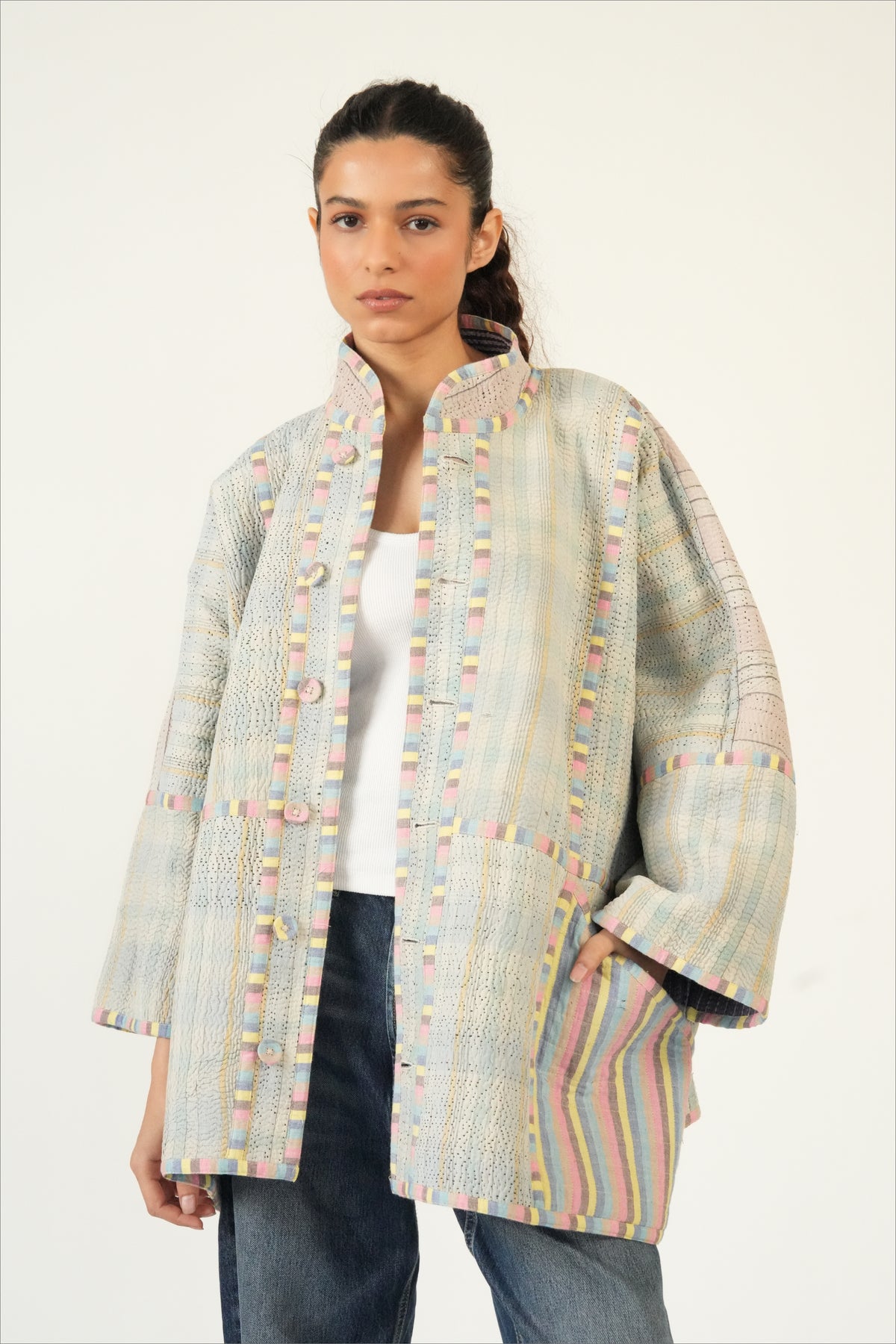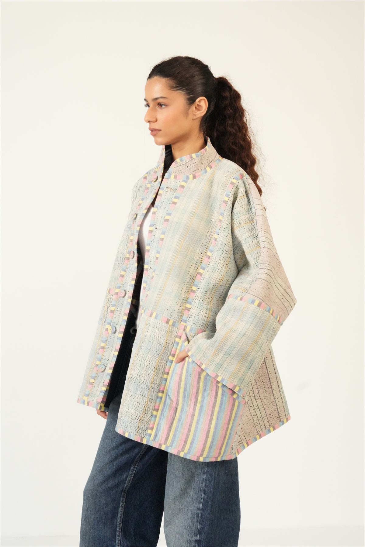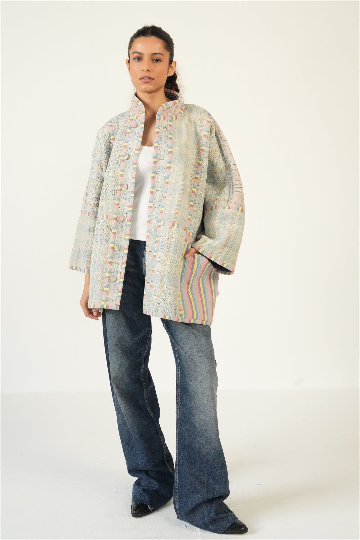 Two coats in one — twice the color, twice the story. The Revival Reversible Coat is created from reclaimed vintage cotton Kantha quilts married with leftover fabric from some of our best-selling Chex textiles, each side revealing a different palette and personality. Flip it depending on your mood, your outfit, or the season; each way offers its own charm. Because every quilt and textile pairing is unique, your coat is truly one of a kind.