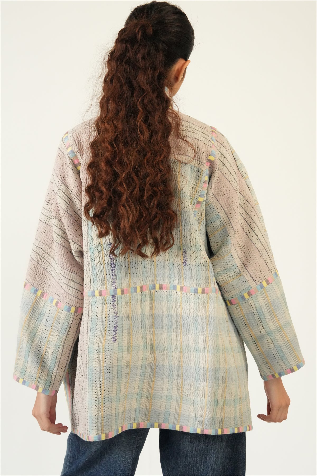 The quilts themselves carry subtle signs of their past life — softness from years of wear, unexpected pattern pairings, small repaired areas — details that add depth and texture rather than perfection. Thoughtful accents like the pocket trim and piping are finished with leftover fabric from some of our best-selling Chex textiles, adding graphic contrast while giving new life to cherished materials. The silhouette is intentionally relaxed and fluid, designed to fall open with ease, layer beautifully, and move comfortably through your day.