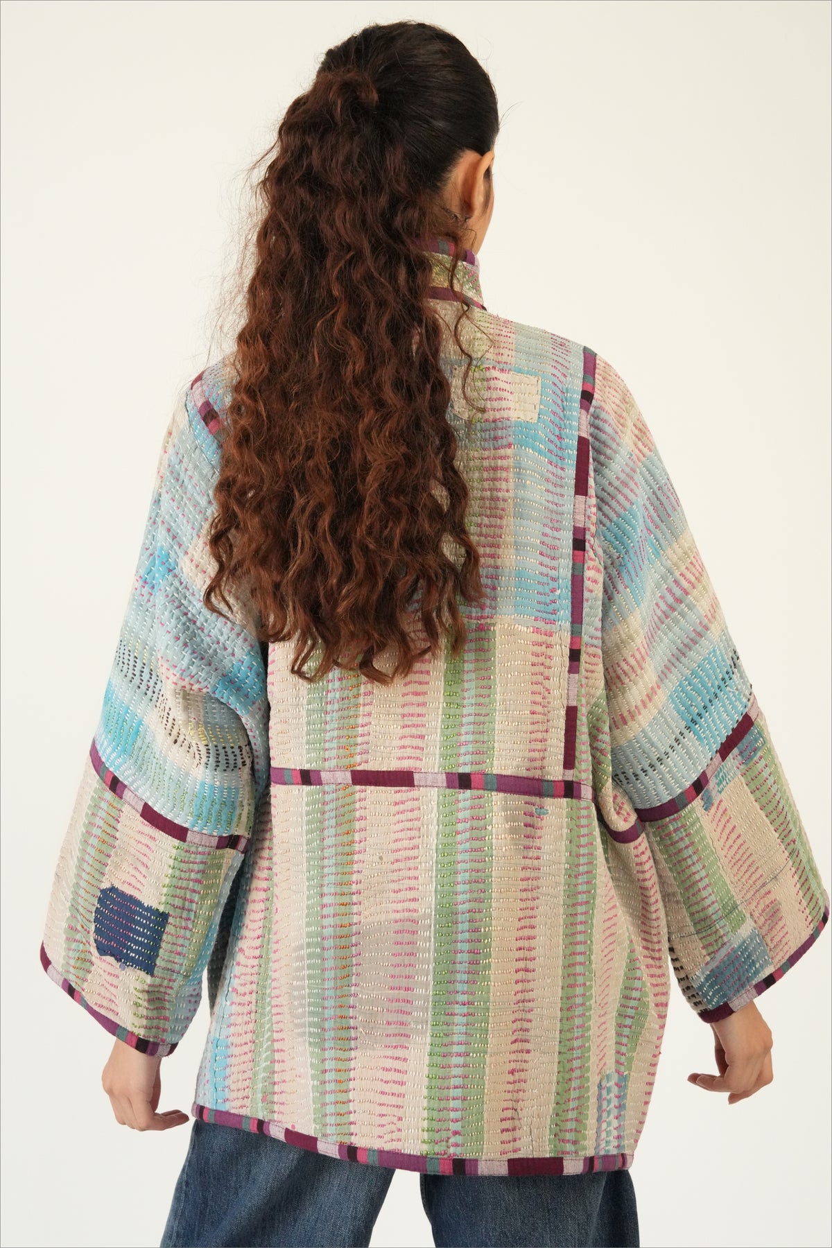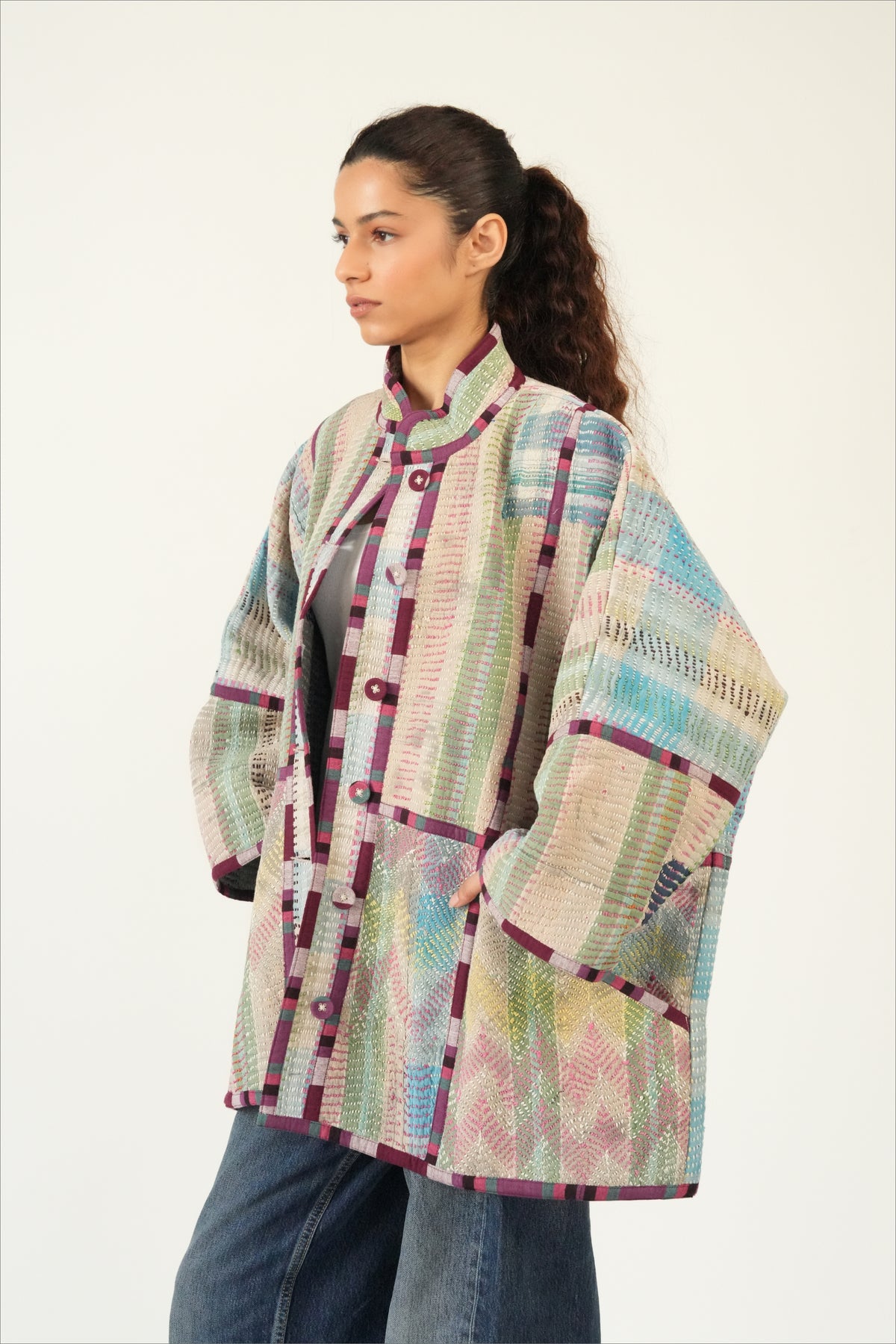 Two coats in one — twice the color, twice the story. The Revival Reversible Coat is created from reclaimed vintage cotton Kantha quilts married with leftover fabric from some of our best-selling Chex textiles, each side revealing a different palette and personality. Flip it depending on your mood, your outfit, or the season; each way offers its own charm. Because every quilt and textile pairing is unique, your coat is truly one of a kind.