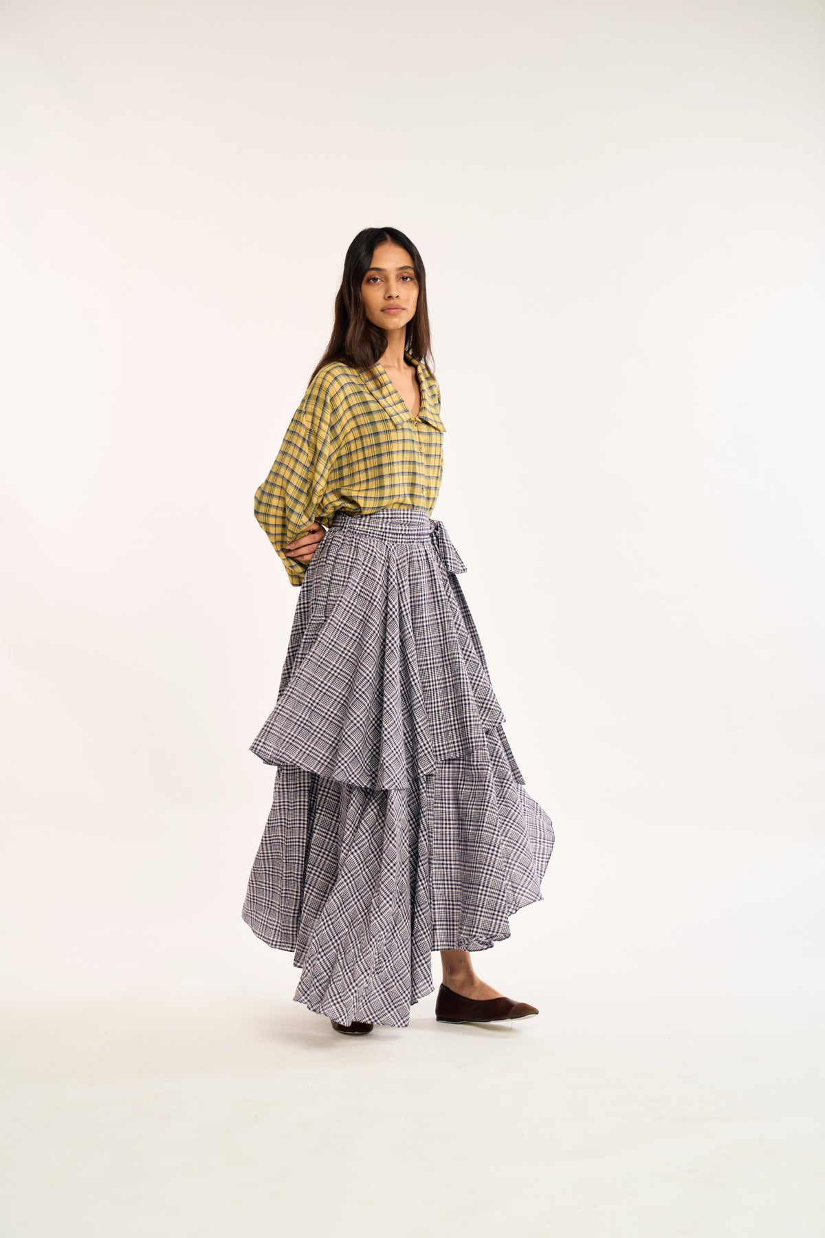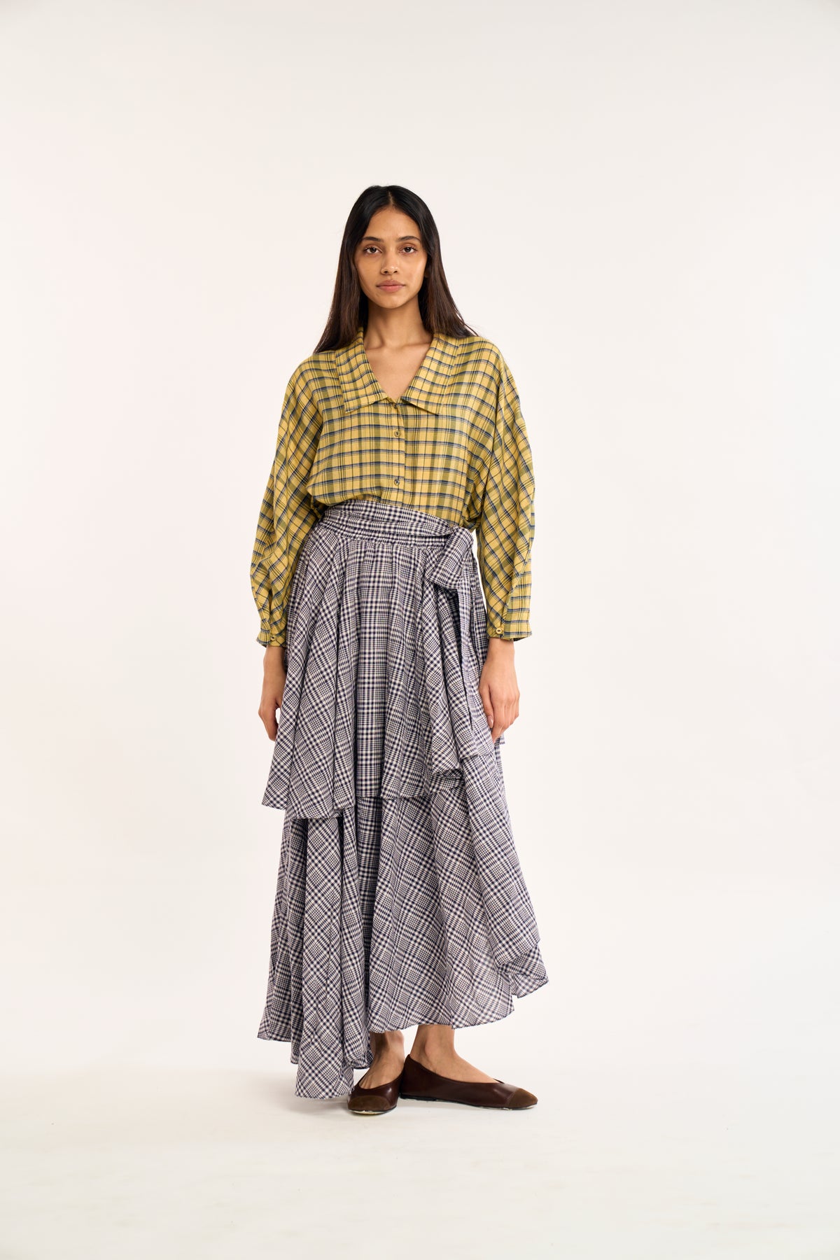 • Wrap-style maxi skirt in classic plaid for a timeless, versatile look