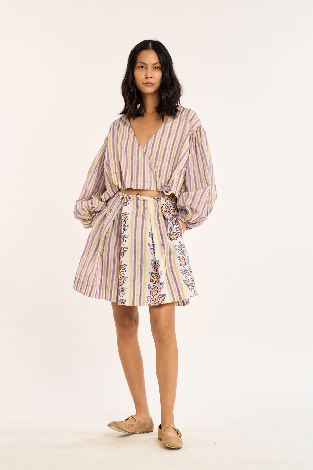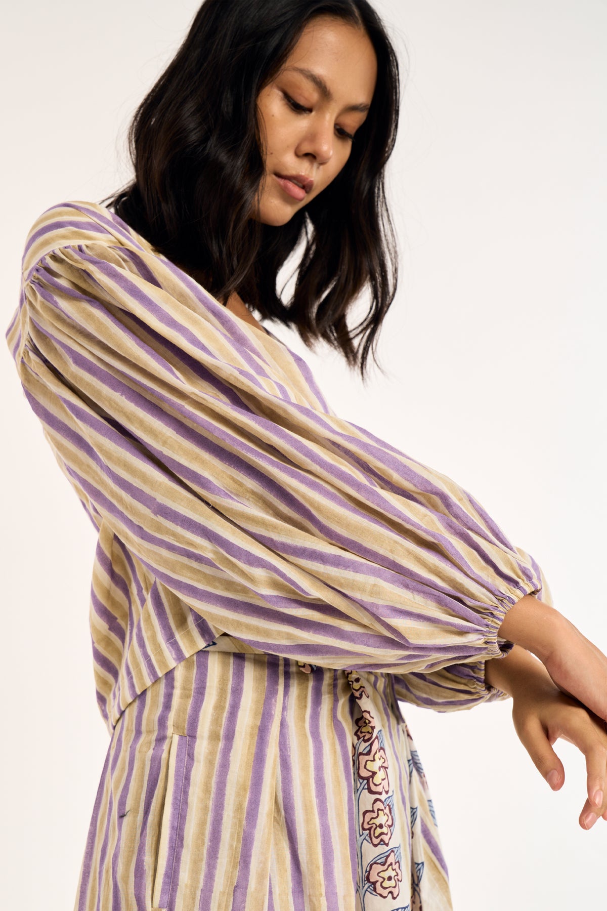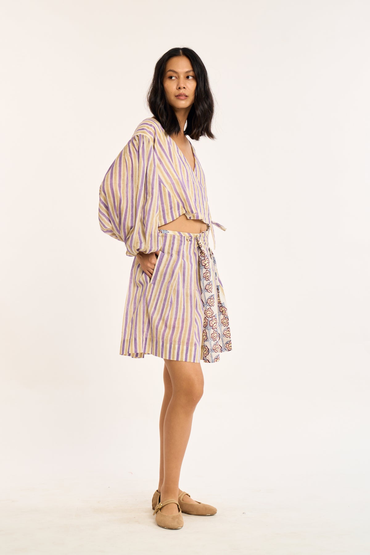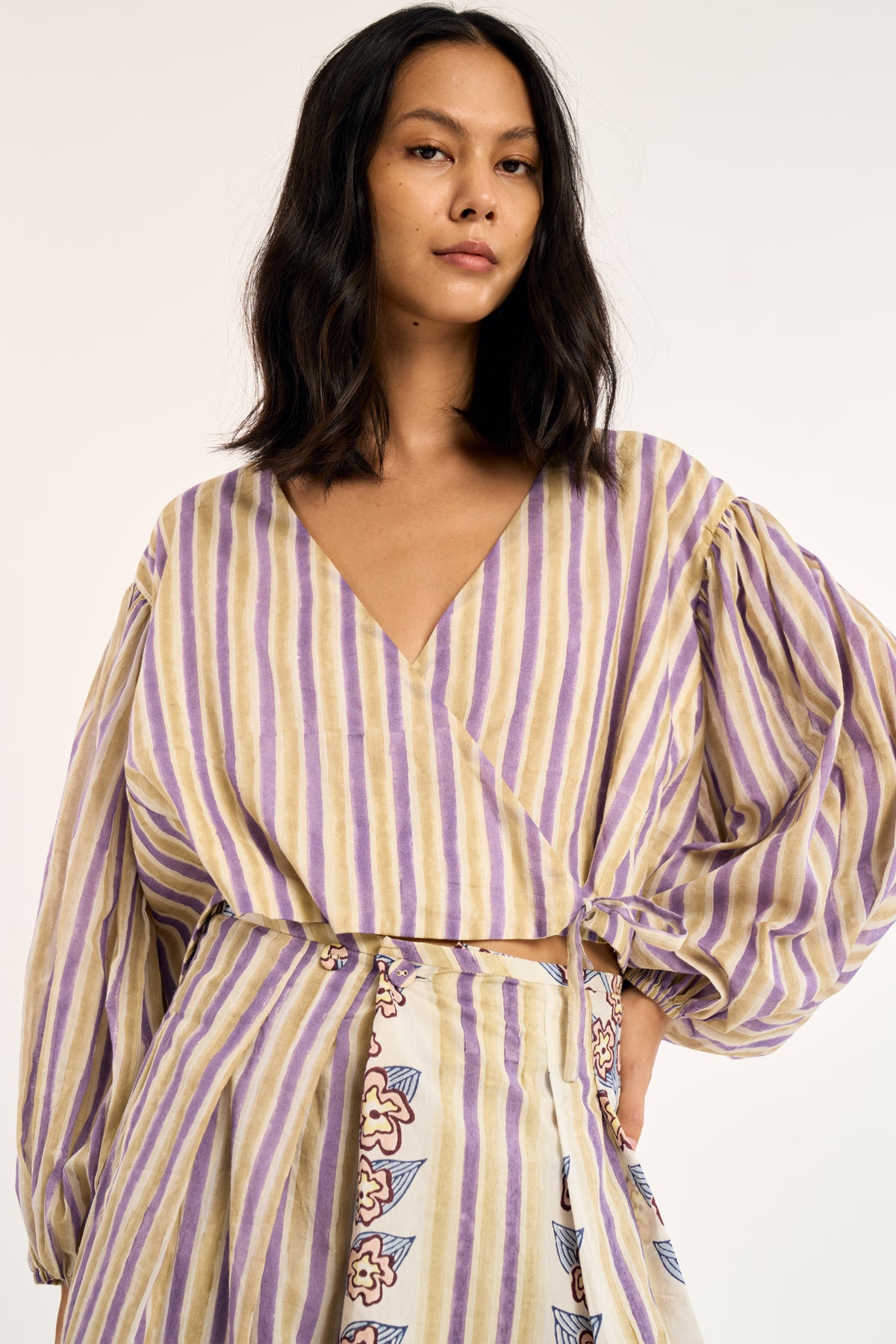 Wrap silhouette with gentle volume through the sleeves