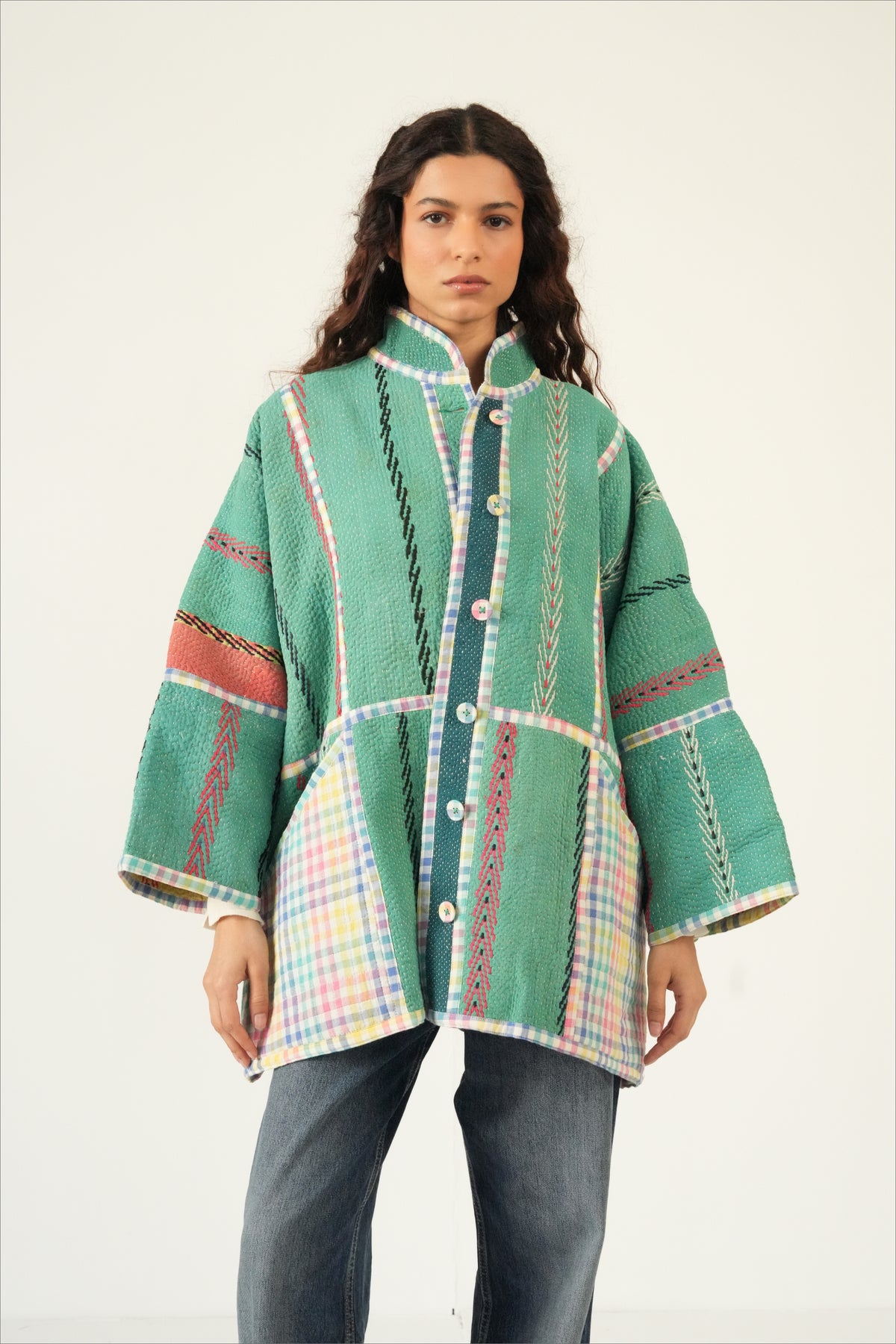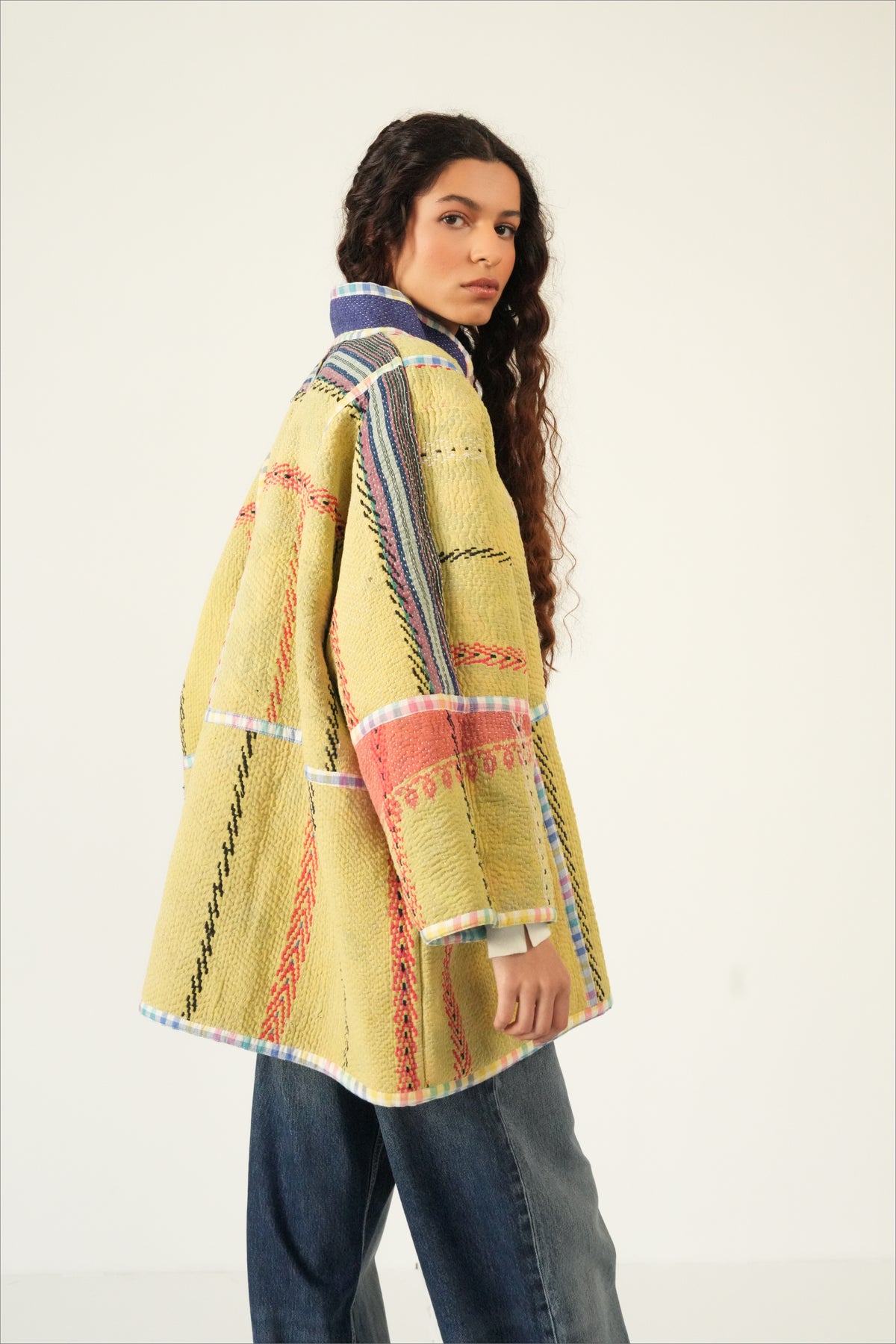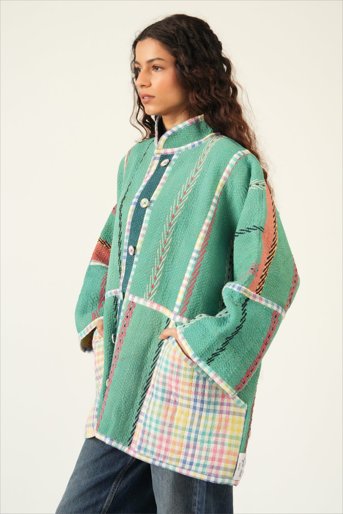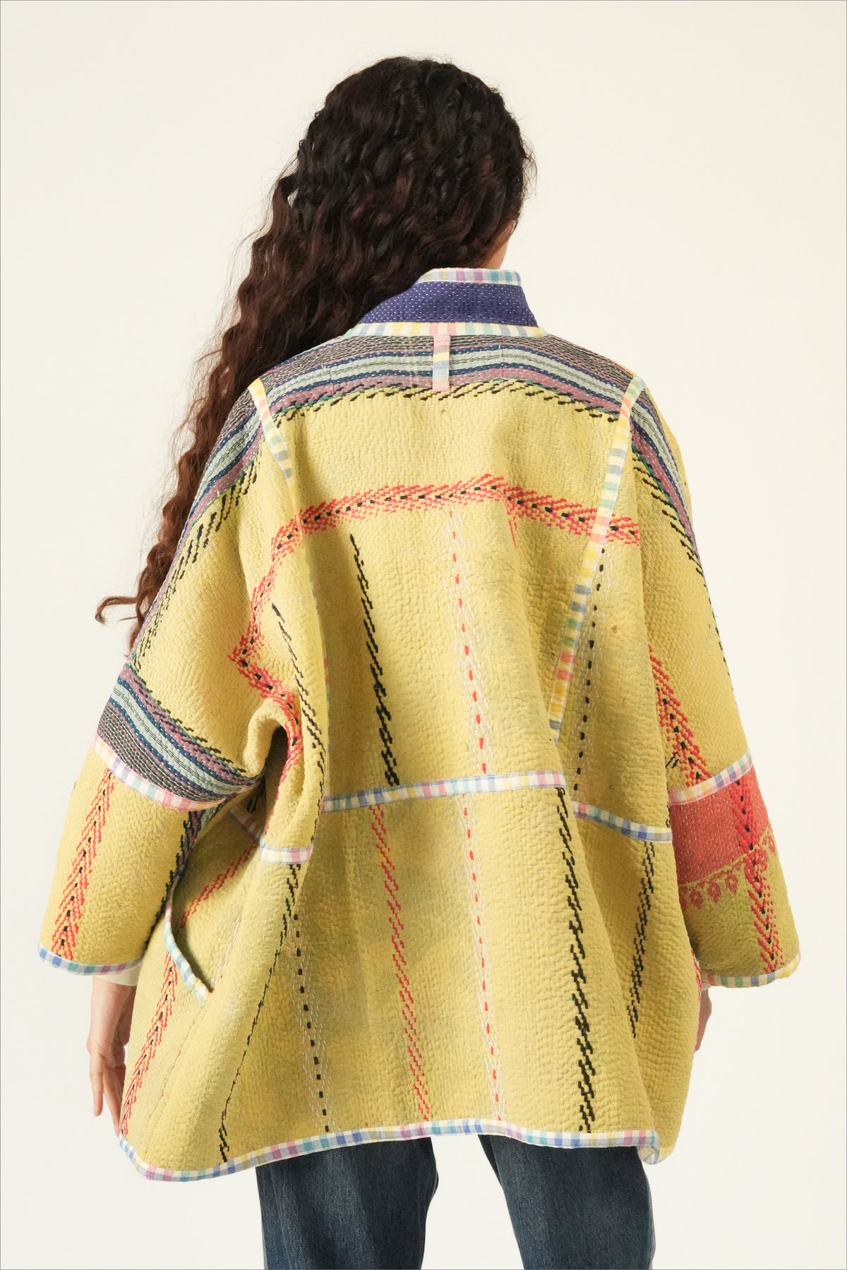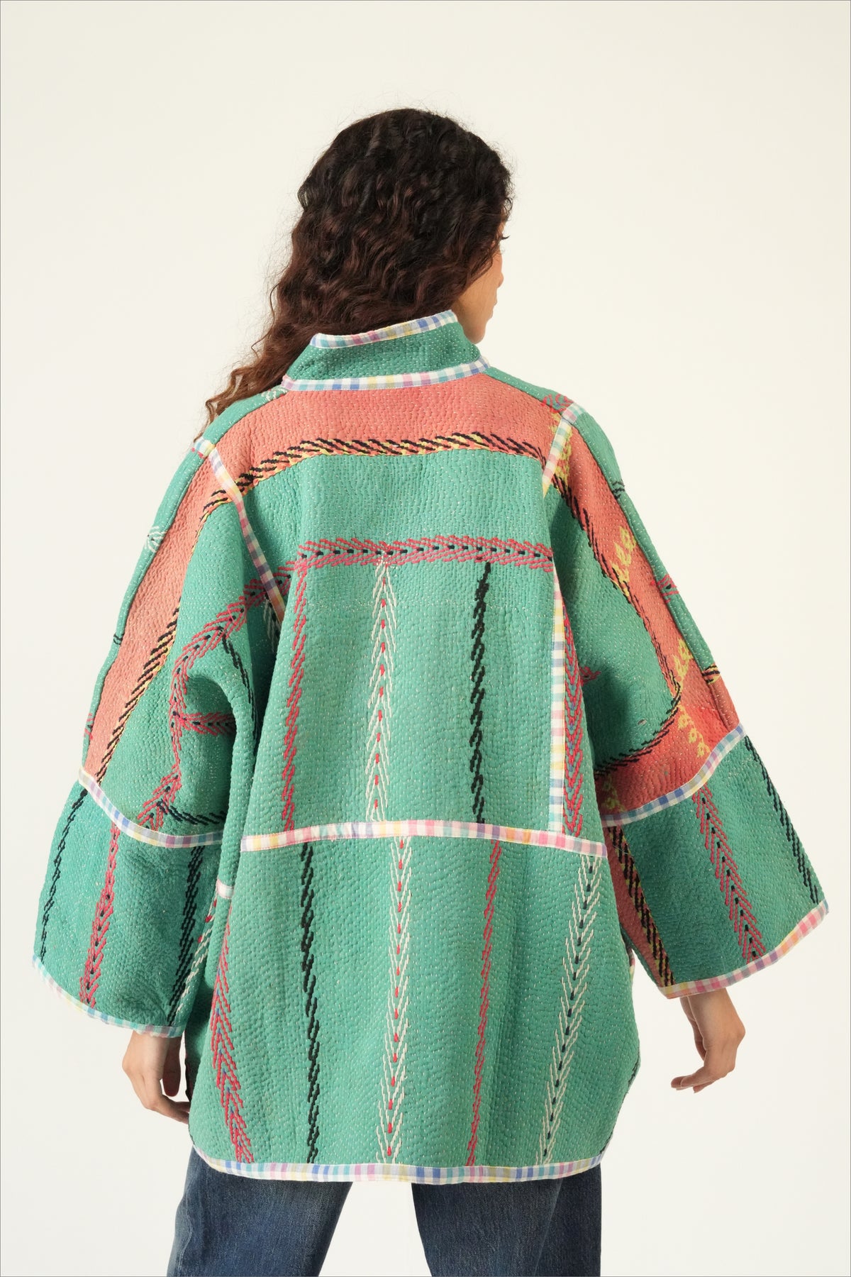 Two coats in one — twice the color, twice the story. The Revival Reversible Coat is created from reclaimed vintage cotton Kantha quilts married with leftover fabric from some of our best-selling Chex textiles, each side revealing a different palette and personality. Flip it depending on your mood, your outfit, or the season; each way offers its own charm. Because every quilt and textile pairing is unique, your coat is truly one of a kind.