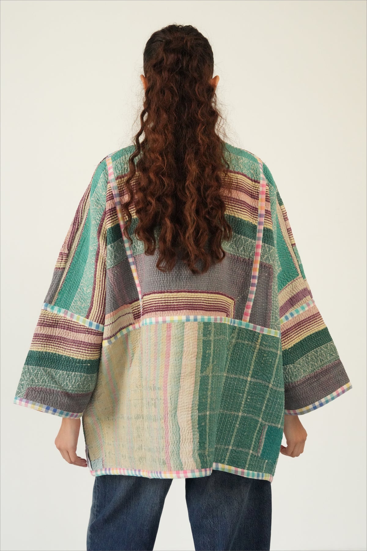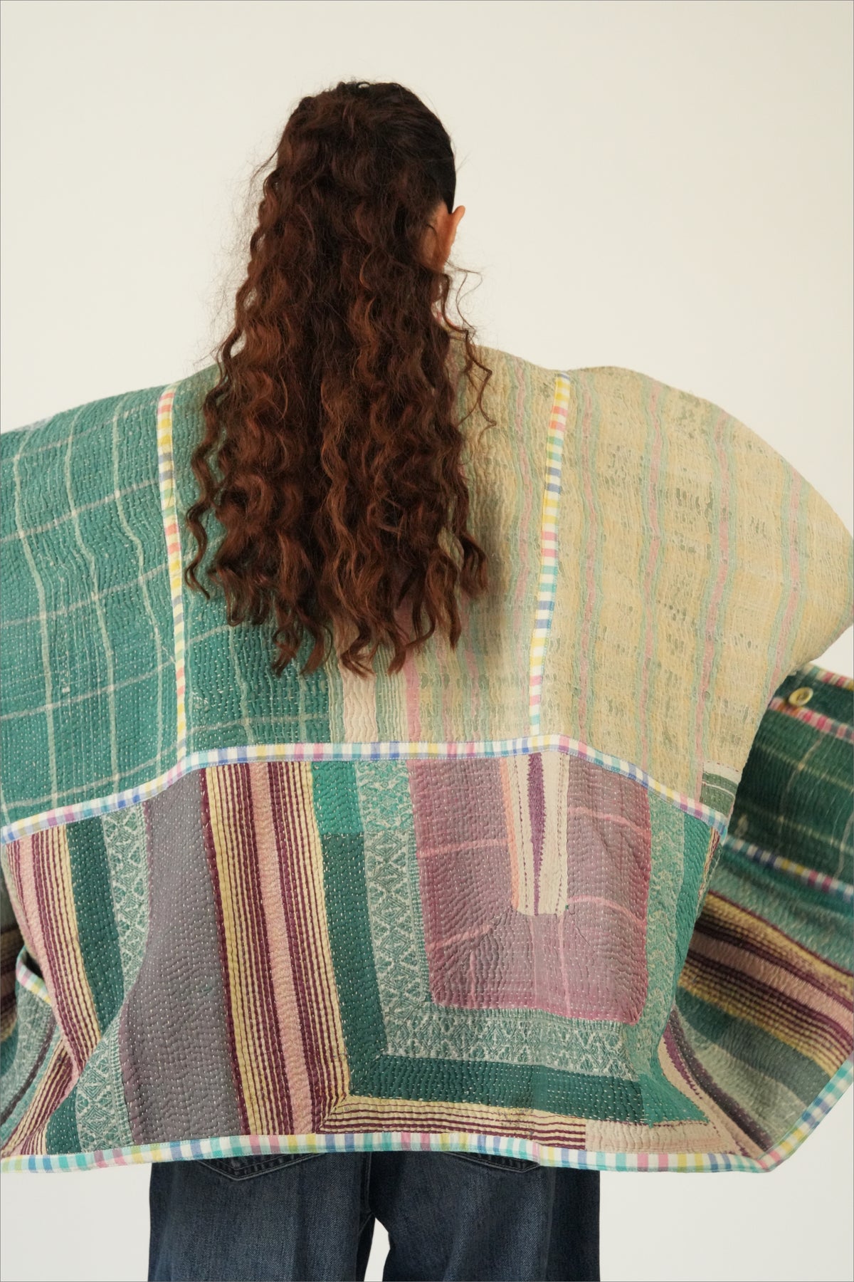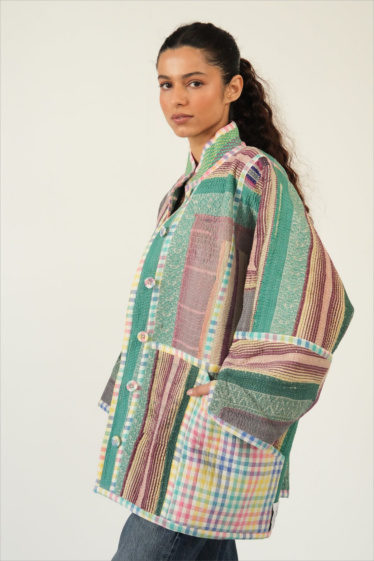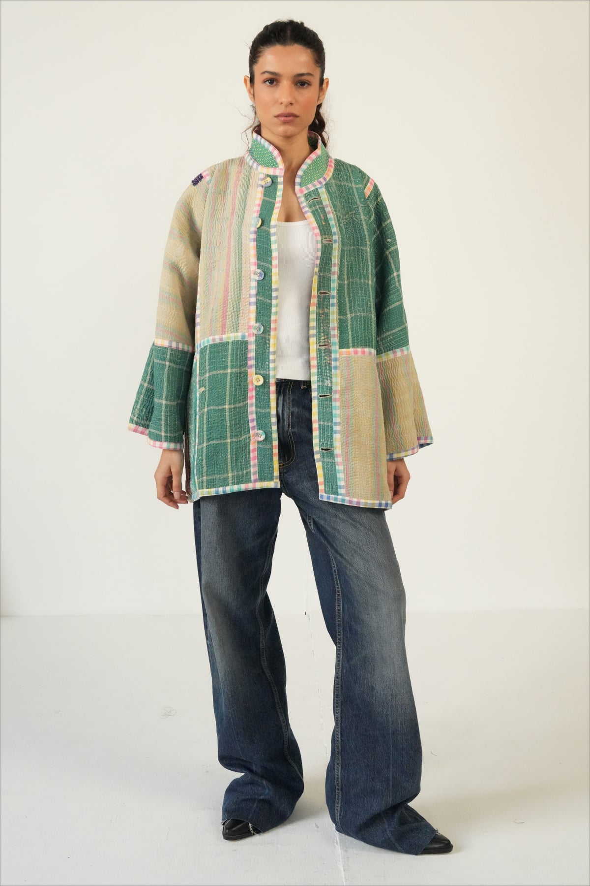 Two coats in one — twice the color, twice the story. The Revival Reversible Coat is created from reclaimed vintage cotton Kantha quilts married with leftover fabric from some of our best-selling Chex textiles, each side revealing a different palette and personality. Flip it depending on your mood, your outfit, or the season; each way offers its own charm. Because every quilt and textile pairing is unique, your coat is truly one of a kind.