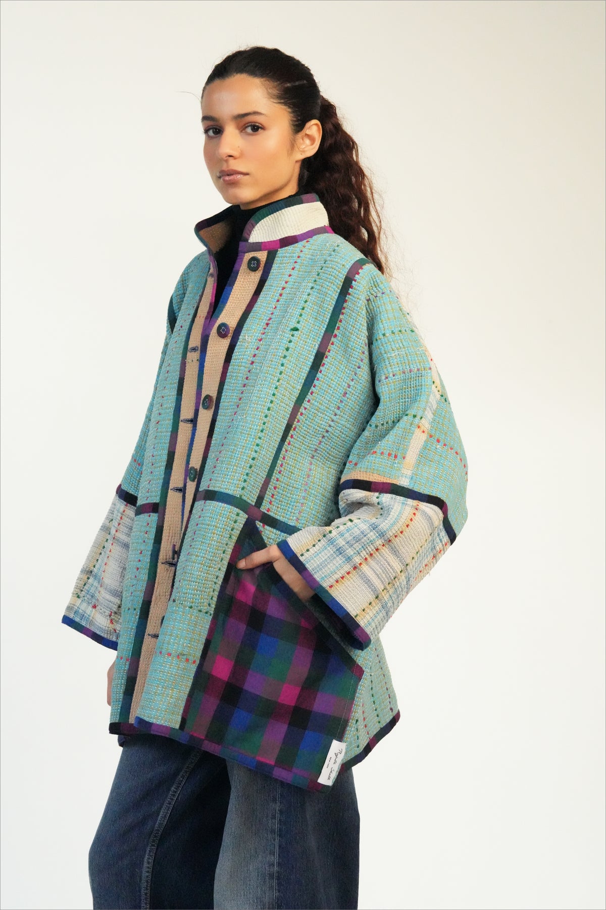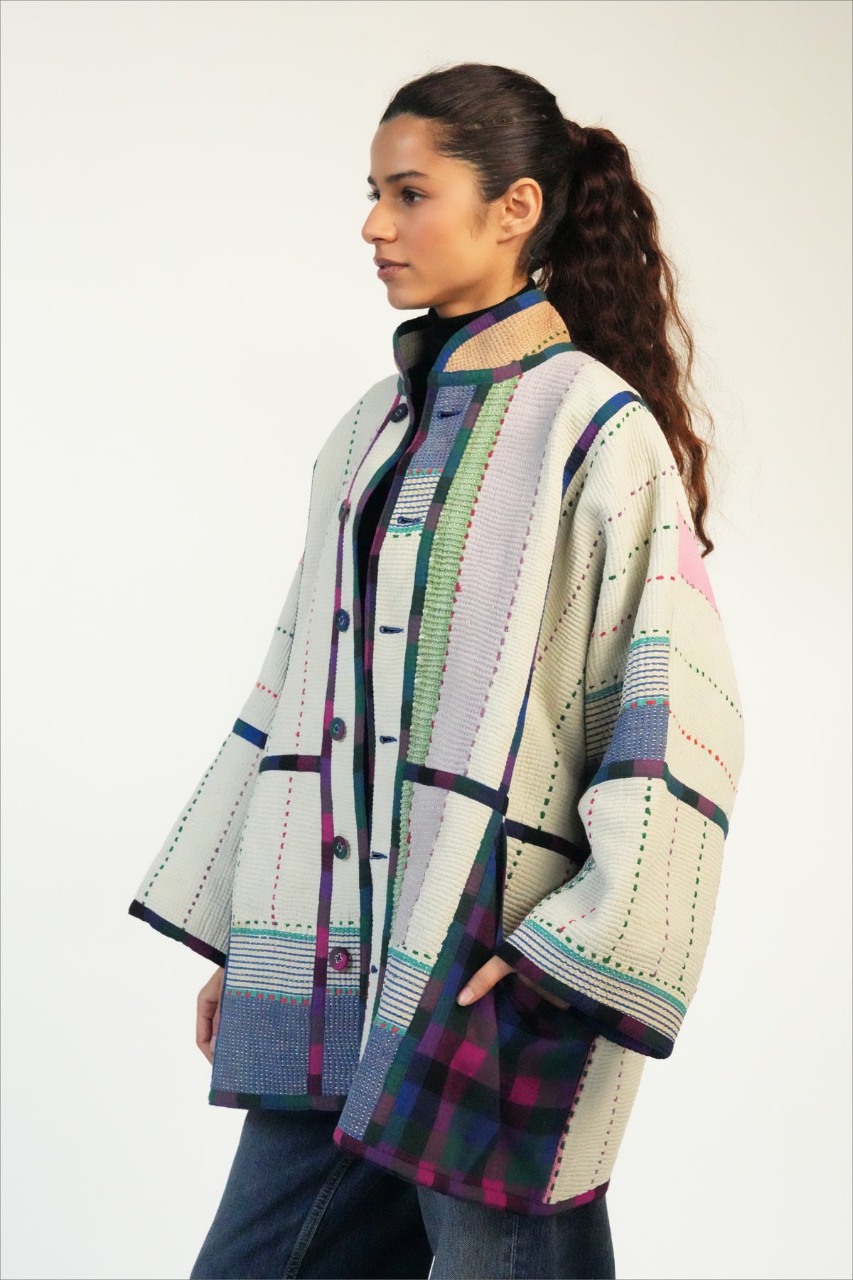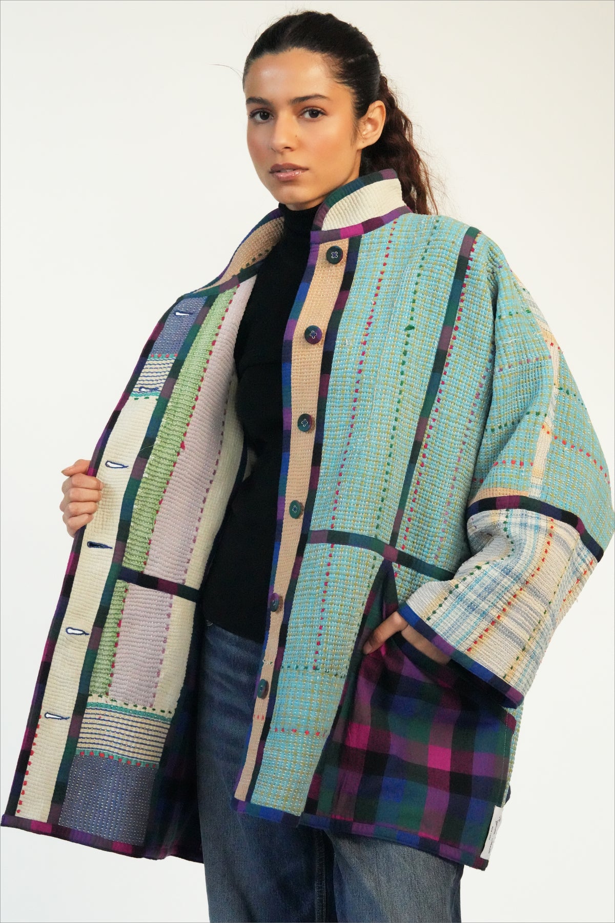 Two coats in one — twice the color, twice the story. The Revival Reversible Coat is created from reclaimed vintage cotton Kantha quilts married with leftover fabric from some of our best-selling Chex textiles, each side revealing a different palette and personality. Flip it depending on your mood, your outfit, or the season; each way offers its own charm. Because every quilt and textile pairing is unique, your coat is truly one of a kind.