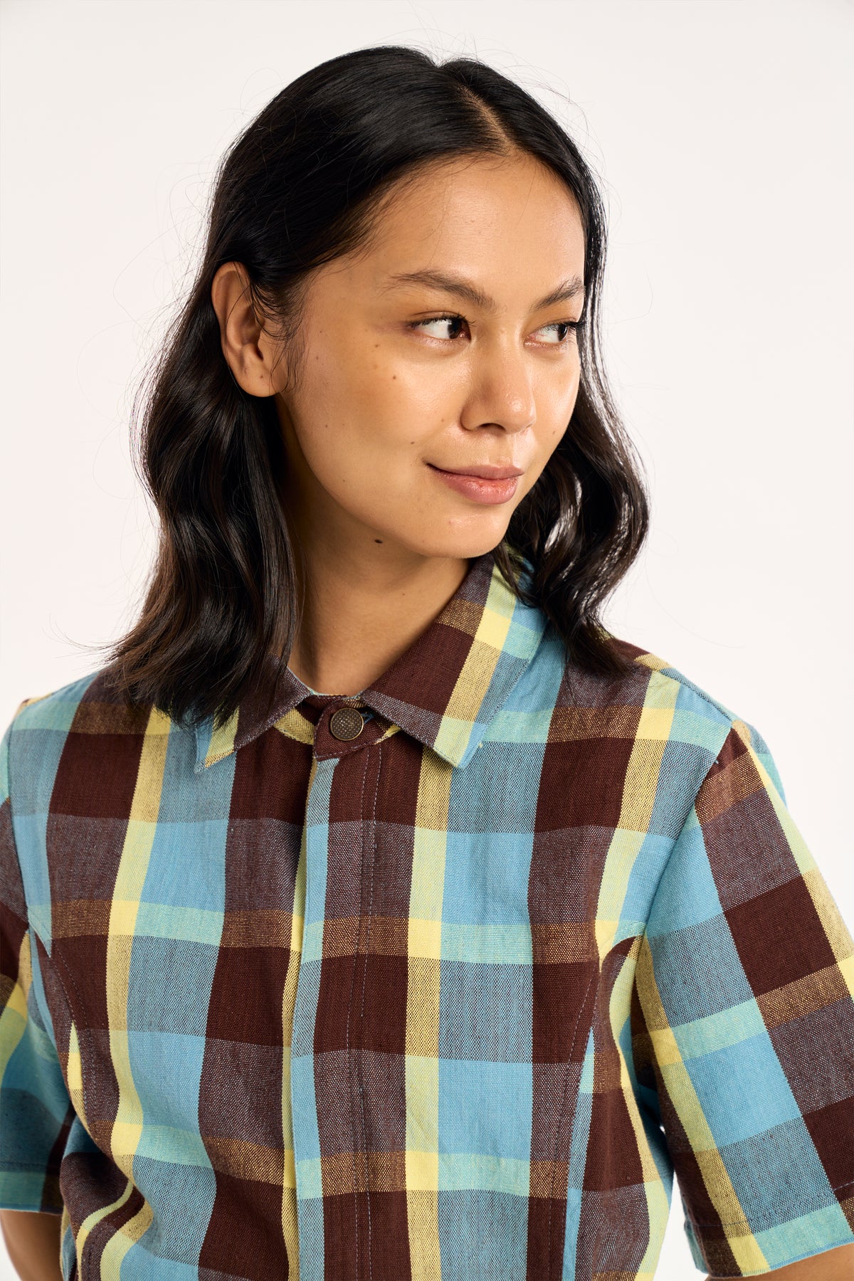 Short-sleeve jumpsuit in a bold multicolor plaid with earthy tones